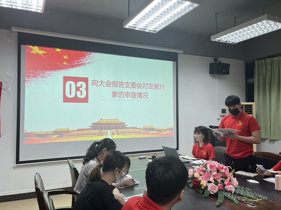 接着,由学生副书记曾李锋同志向大会报告支委会对发展对象的审查情况,宣布钟观带等6名重点发展对象的审查结果全部通过。在与会党员对发展对象是否符合党员条件发表意见进行不记名投票表决环节时,非正式党员在会议室外稍作等候。统计票数后,由宣传委员王薇薇同志宣读支部大会的决议:同意钟观带等6名重点发展对象转为中共预备党员。
