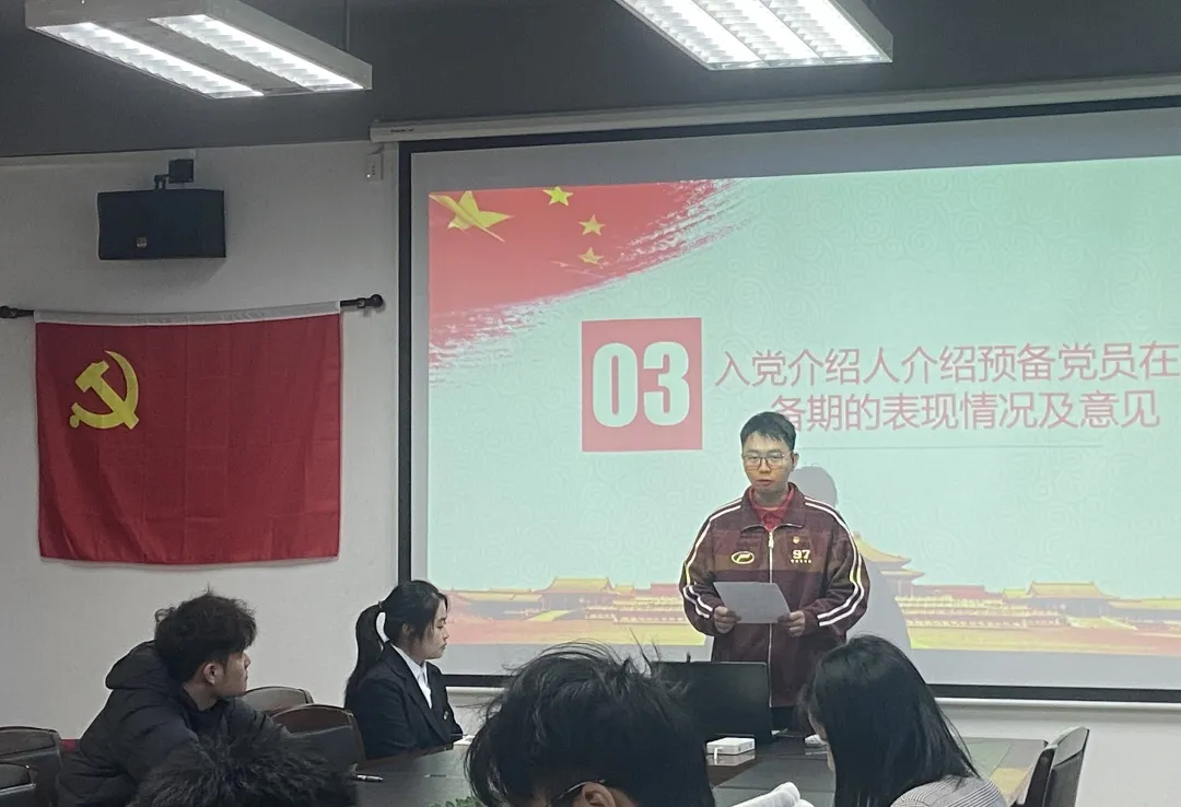 会议第三项流程,入党介绍人杨艳美、王来祥对钟晓艳、林培基2名预备党员在预备期间的政治思想、学习成绩、为师生服务的情况进行阐述,并同意其按期转正。