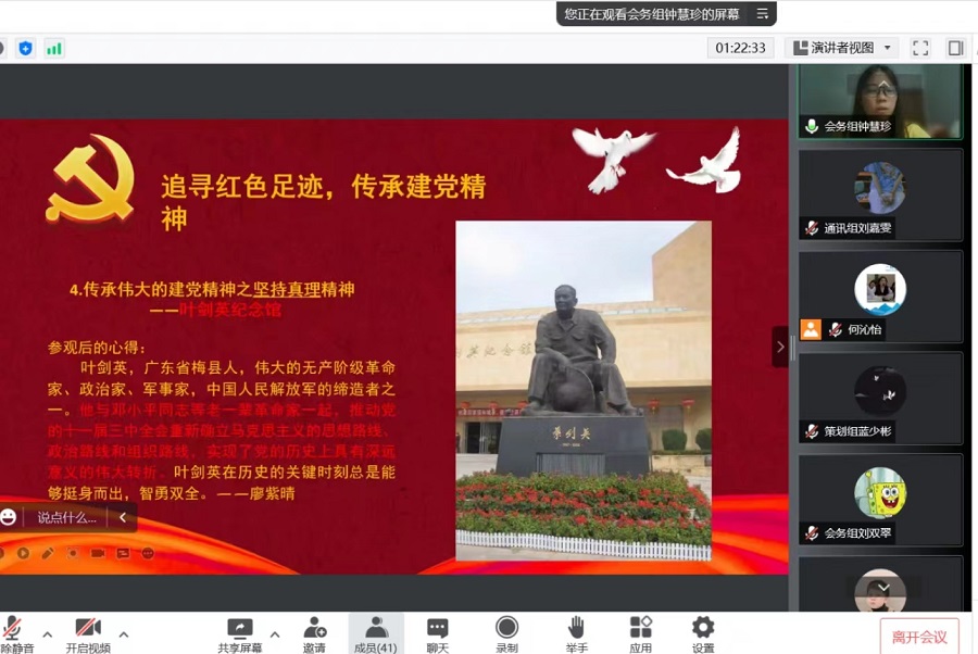 为庆祝中国共产党建党101周年,香港回归25周年,引导党员同志坚定理想信念,厚植爱党爱国情怀,太阳成集团tyc33455学生第一党支部于7月29日在腾讯会议开展“庆七一建党,追寻红色足迹”主题党日活动,参加本次活动的有党支部书记饶宏玉同志及全体学生党员,此次活动由何沁怡同志主持。