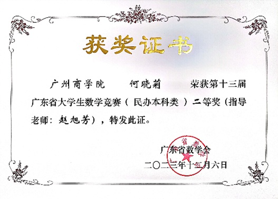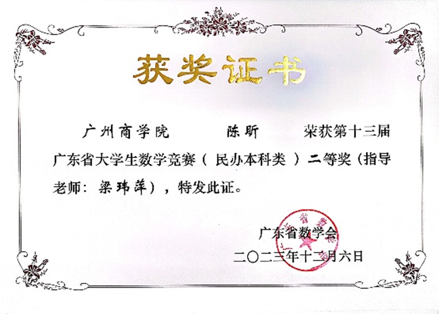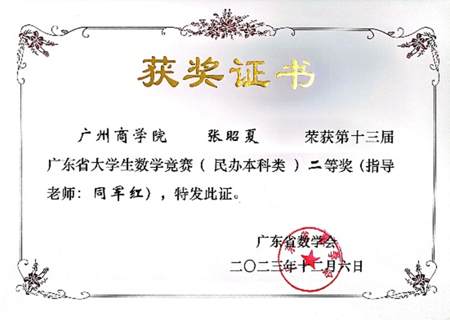 近日,第十五届全国大学生数学竞赛(广东赛区)成绩揭晓,在学校教务处的大力支持下,太阳成集团tyc33455精心组织和培训了我校48名同学参赛,首次参赛就取得不俗的成绩。其中25名学子喜获佳绩,在广东民办高校数学类竞赛中荣获广东省一等奖2项、二等奖7项、三等奖16项,同时,我校教师同军红老师被授予“优秀指导老师”称号。