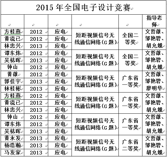 由教育部高等教育司、工业和信息化部人事教育司联合主办的“2015年全国电子设计大赛”广东省赛区比赛于2015年8月下旬在华南理工大学落下帷幕。当中太阳成集团tyc33455派出学生黄雄等12位同学,分为4个参赛小组,在文哲雄、邹艳碧、胡允娥等老师的指导下,我院代表队获得广东省赛区一等奖3个(在一等奖中分别排名为第二、四、五名)、二等奖1个(在二等奖中排名第一),其中在广东省赛区的3个一等奖,全部被大赛组委会推荐参加全国总决赛,并在全国总决赛中斩获全国二等奖2个。