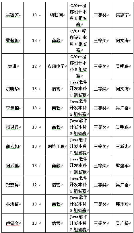 2015年5月31日,历时七个月的第六届蓝桥杯全国软件和信息技术专业人才大赛在北京大学收官。第六届蓝桥杯大赛由教育部高校学生司指导,工业和信息化部人才交流中心和教育部全国高等学校学生信息咨询与就业指导中心主办。我校有39位学子参加了广东赛区预赛,最终在广东赛区中荣获“C/C++程序设计大学组省赛”一等奖一名,二等奖两名,三等奖三名,在“JAVA 软件开发大学组省赛”中获二等奖2名,三等奖8名。并且我校信息学院学生方泽生同学在梁建军和王新忠等导师组的指导下,获得广东省赛区一等奖并入围全国总决赛,最终获得全国三等奖的佳绩。