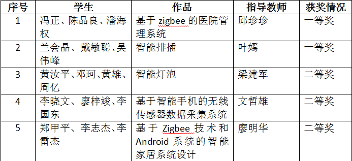 我院计算机系学生在邱珍珍,叶嫣,梁建军,文哲雄和廖明华等老师的带领下,共5支队参加华南分赛区决赛。选手们围绕“物联网”的大主题,结合自身所学,充分利用物联网的相关技术,设计出“基于zigbee的医院管理系统”、“智能排插”、“基于智能手机的无线传感器数据采集系统”等作品,进行现场展示并答辩。通过激烈的比拼,,获得华南赛区一等奖2项,二等奖3项。