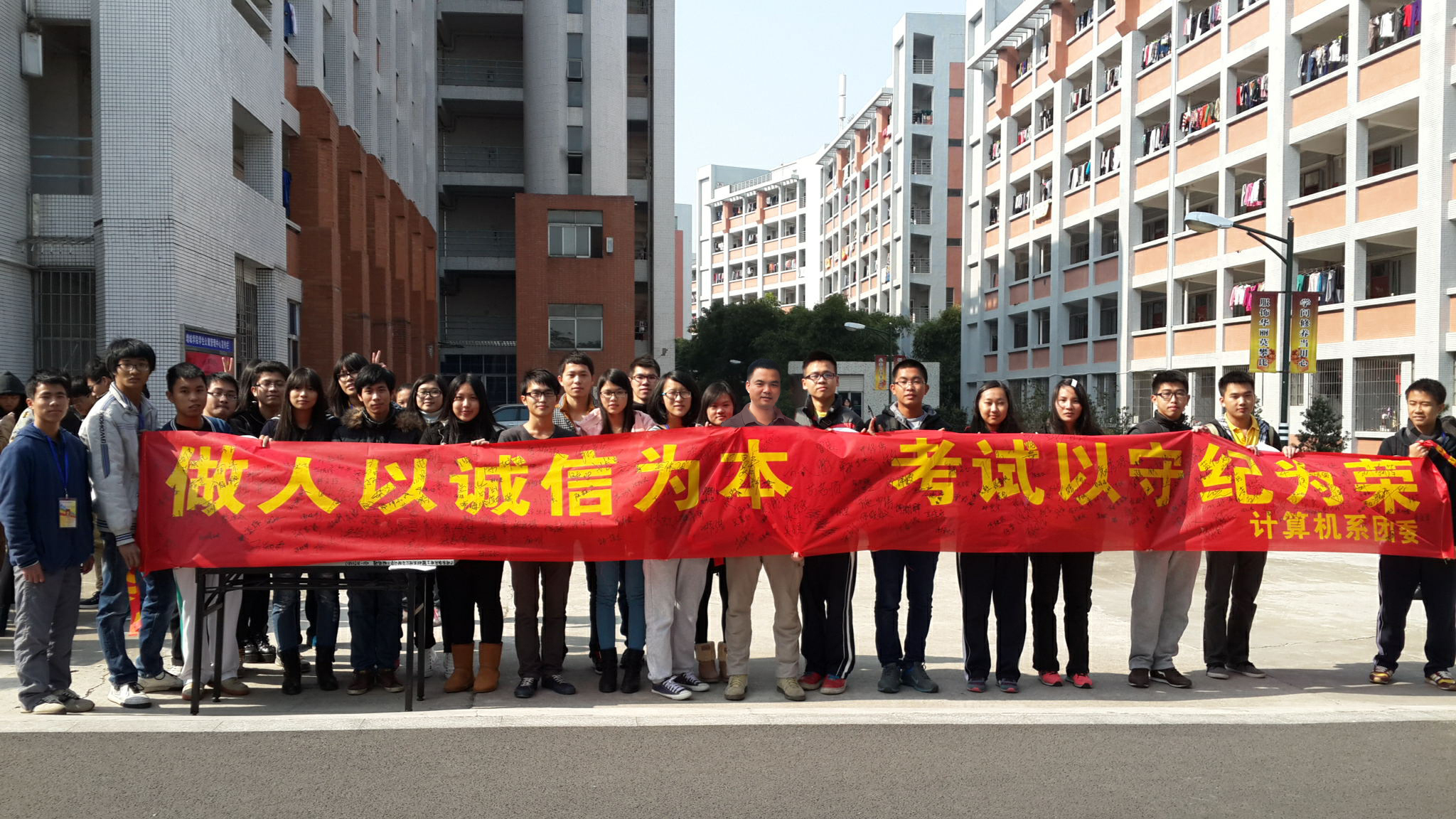 为了宣传和发扬“做人以诚信为本,考试以守纪为荣”的良好品德,培养学生诚信考试,计算机系团委于12月24日中午,在舞蹈室对面举行了诚信考试签名活动,参加此次活动的有计算机系党总支书记钟远辉、计算机系团委书记黄玉婷、计算机系团委副书记王澜等。