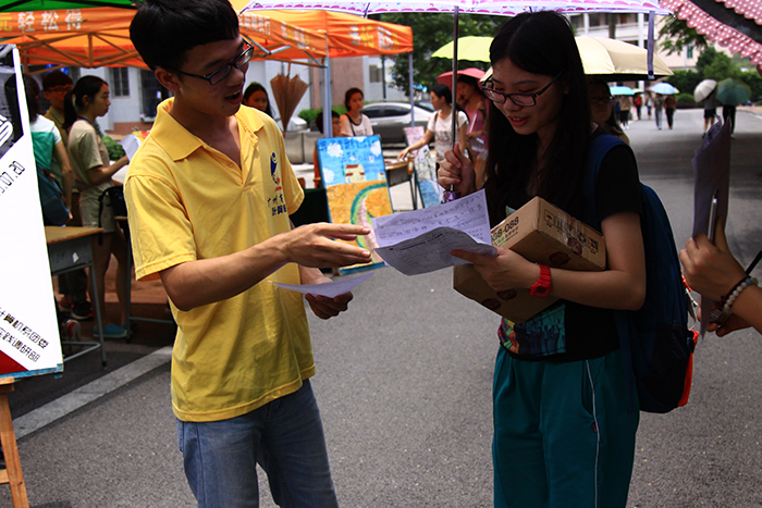 宣传初始时,天气的湿热让人感到浑身不舒服,但这并不能磨灭干部干事们的宣传热情。还没到下课时间,干部干事们已经身着明黄色工作服,在校道上等待同学们的到来。而对本次活动感兴趣或存在些许疑惑的同学,工作人员积极详细地为其解答,并对“三下乡”社会实践活动的内容作出系统性的介绍,让同学们对此次活动有大致的了解。