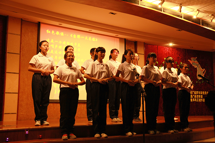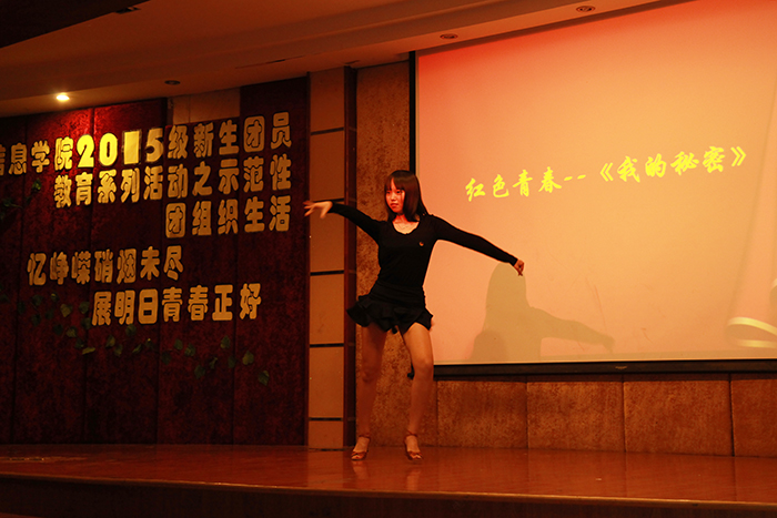 发言过后,同学们一同观看了红色视频《峥嵘岁月》以及聆听红色歌谣,现场观众都细细品味其中,在为伟大的祖国而自豪、骄傲的同时,也意识到中国伟大复兴之重任已落到其肩上,其更需做到勿忘国耻、为中华之崛起而奋斗、而读书。随后幽默而又精彩的魔术让大家捧腹大笑,活跃了现场气氛。接下来的是红色故事《曾记否》的演绎,激情昂扬的演讲与扣人心弦的抗战哑剧的完美融合,深深吸引了观众的眼光。在其意犹未尽之时,拉丁独舞与《我的秘密》单人独唱让大家一饱眼福。而后的阅兵视频《看今朝》令在座各位心潮澎湃,大家仿佛回到两个多月以前的阅兵式,那种为祖国自豪骄傲的爱国情怀油然而生。最后迎来的是由15级代表带来的合唱《光辉岁月》,随着歌曲乐章的响起,同学们纷纷为台上演唱的同学挥舞手中的闪光灯,情至深处,更是一起大声合唱,在大家沉醉于这首耳熟能详的歌曲时,活动也画上圆满句号。