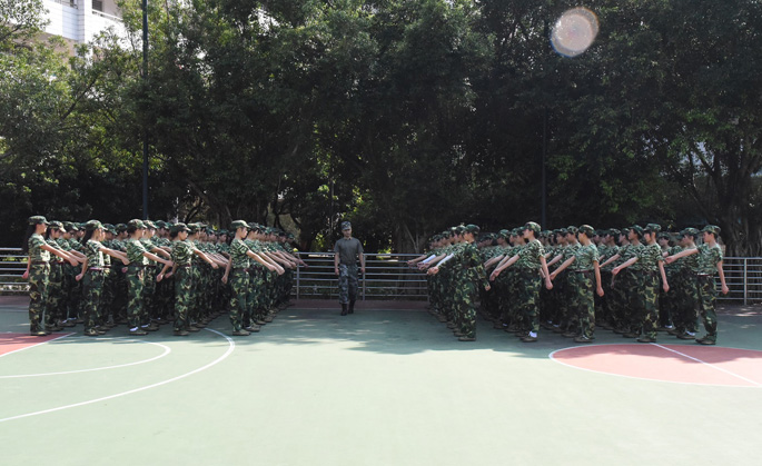 男生在烈日下站军姿之后就在教官的带领下开始军体拳的练习,抬手、抬腿、定住,一个一个动作反复练习,没有丝毫懈怠。而女生在其教官的带领下进行停止间转法等动作练习。一个上午,全体成员都学到了新知识。