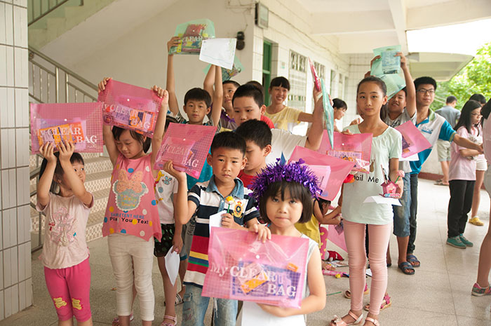 拿到文具的孩子们