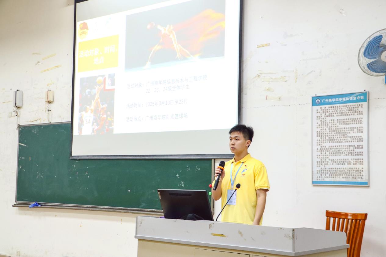 会议伊始,张奕桐对本次篮球赛进行介绍。同时,说明了活动对象为学院全体学生,并公布比赛的时间安排和具体地点,让大家对赛事有了清晰的认知。随后,张奕桐对赛程安排进行深入讲解。讲解过程中,张奕桐巧妙地借助比赛流程图,以直观、简洁的方式阐释了比赛的具体方式,让复杂的赛制一目了然。其中,张奕桐着重强调了比赛的注意事项,对运动员的着装规范进行了严格要求。同时,针对全体参赛人员,给出温馨提示,确保大家以最佳状态投入比赛。此外,还特别提醒了赛前的准备要点,尤其是对运动员替赛问题进行了着重强调,以维护比赛的公平公正。