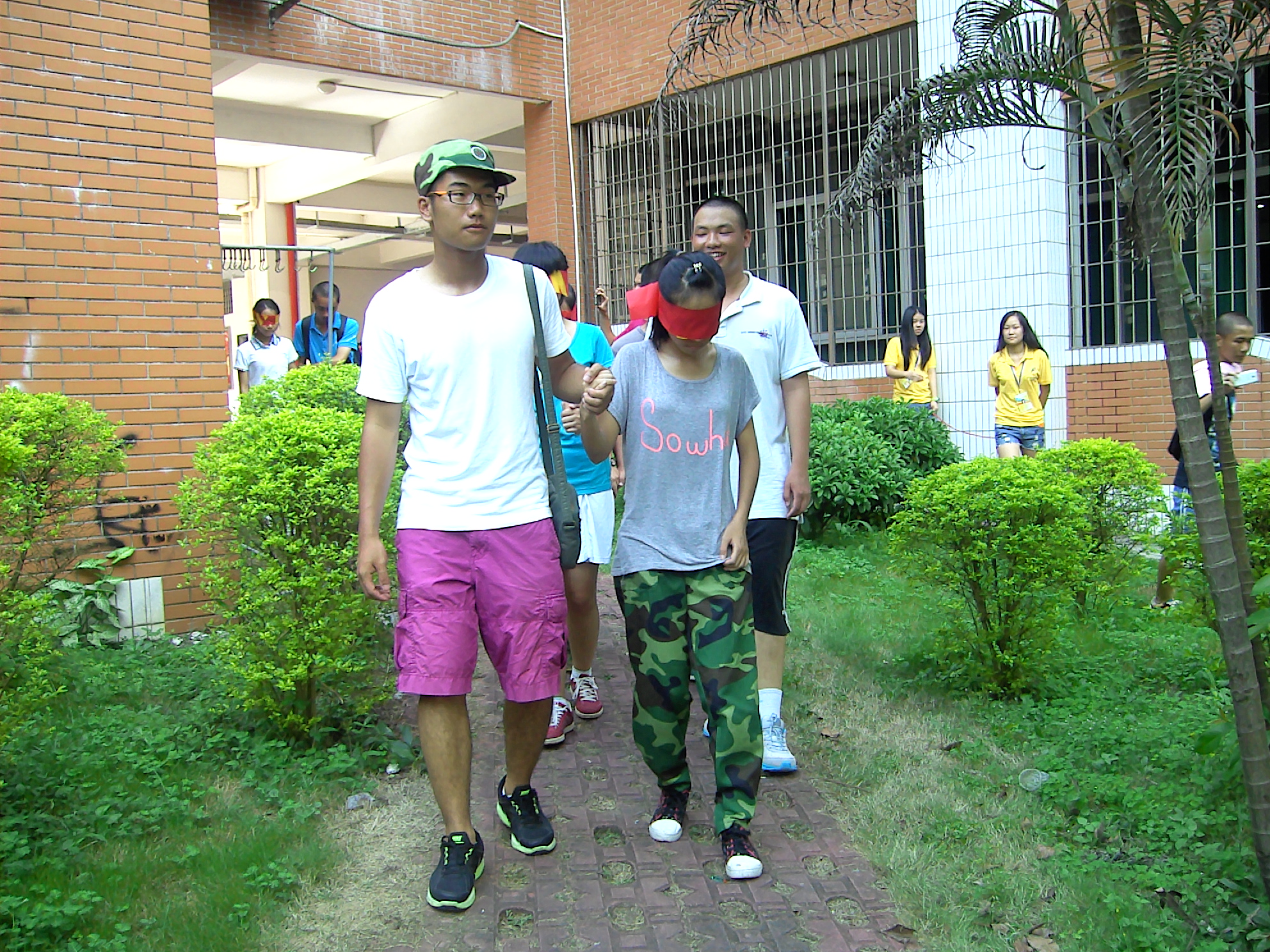 下午2点30分,活动正式开始,新生们早就在指定的地点排队等候各自的助理辅导员进行活动的安排。今天的活动主要有:“瞎子与哑巴”、记住你我他、“哑巴”排队、剪刀石头布、背我过河。起初,新生们都有点拘束,在老师和师兄师姐的热情引领下,大家都不知不觉地全心投入了各项活动中。首先是“瞎子与哑巴”,它需要通过两个人彼此间的信任与坚持才能完成。一个人不能通过语言而只能牵着对方的手来带领他走过各种有障碍的设施,直到回到出发地。活动中最常听到大家欢呼雀跃的是“剪刀石头布”,每一次的比试都能给大家带来许多惊喜和欢乐。大家也从中学会了相互信任、团结合作、彼此宽容。而“记住你我他”是最能够让彼此熟悉的一个活动。在此之中,大家都毫无顾忌地说出自己的名字、家乡和爱好,毫不保留、没有猜疑,很快大家便已相互熟识。