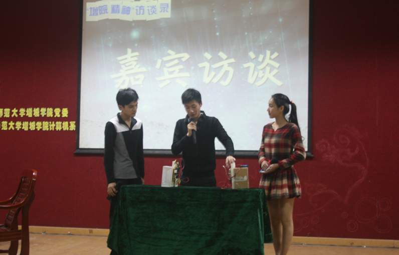 为了进一步弘扬增院精神,让学生更好的适应多样化价值观的社会,2013年11月17日晚,由华南师范大学增城学院党委主办、计算机系承办的以“梦想之灯不灭,探索之路不止”为主题的第三期“增院精神”访谈录在教学楼A206举行。学院党委副书记张秋艳、学院党政办主任周庆华、计算机系党总支书记钟远辉、计算机系副主任吴广裕、计算机系文哲雄副教授、计算机系李绍强老师、学院党政办杨柳莺老师、学院党政办宁金玲老师等出席了本次活动。