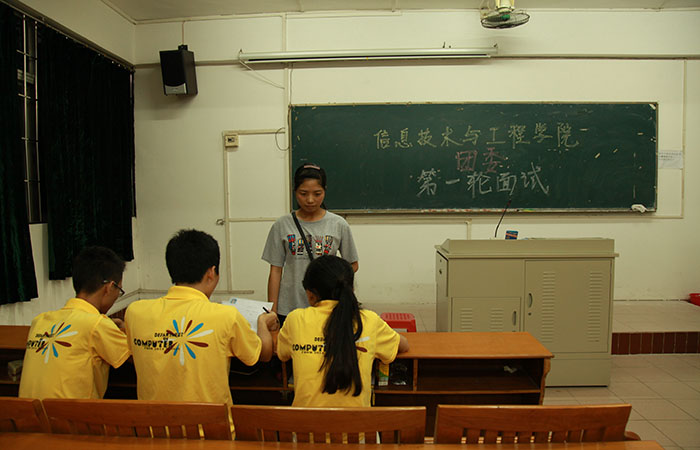 下课铃声的余音尚未散去,上身着黄色工作服的身影便早早地在康大C2栋教学楼课室之间忙碌了开来,无论是各部门面试位置的安排、报名表的核对,亦或面试前各部门内部最后的交流,在一切准备就绪后,太阳成集团tyc33455团委第一轮面试于2015年10月9日18:45在C2教学楼307和308课室中井然有序地进行着,也在略显紧张的气氛中拉开了序幕。