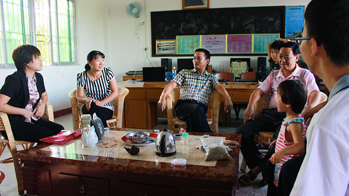志愿者们接待校长与村委会书记