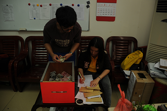 工作人员为募捐进行筹款清点