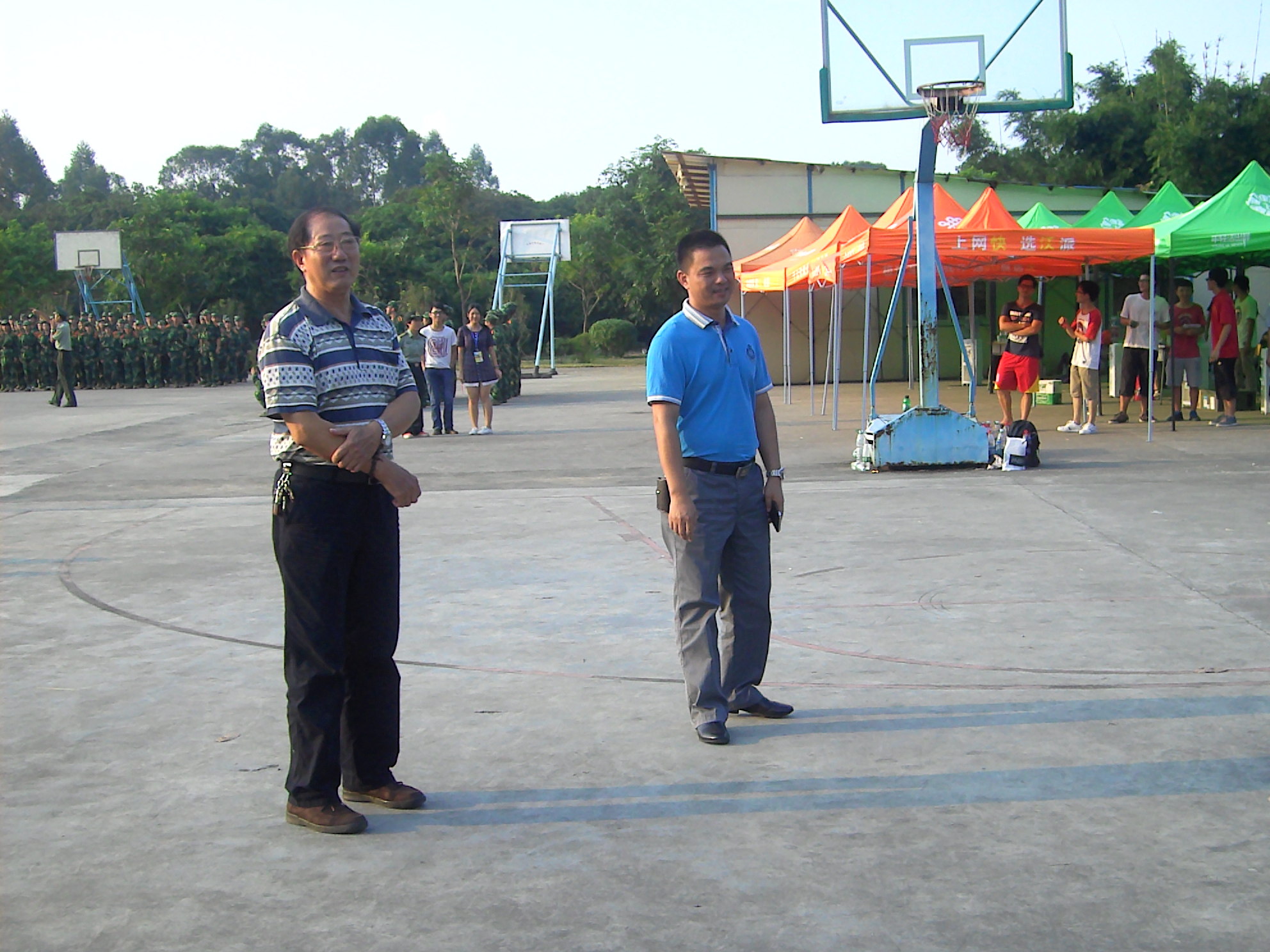 陶培基和钟远辉承训教官们进行了友好的交谈,了解军训情况,表达了计算机系领导对各位教官的感谢,并合影留恋。相信系领导给予的莫大关怀以及大本营中工作人员的无私奉献,再加上教官们的亲身指导,13届的新生们一定可以很好地完成本次军训任务,圆满地通过军训的考验。