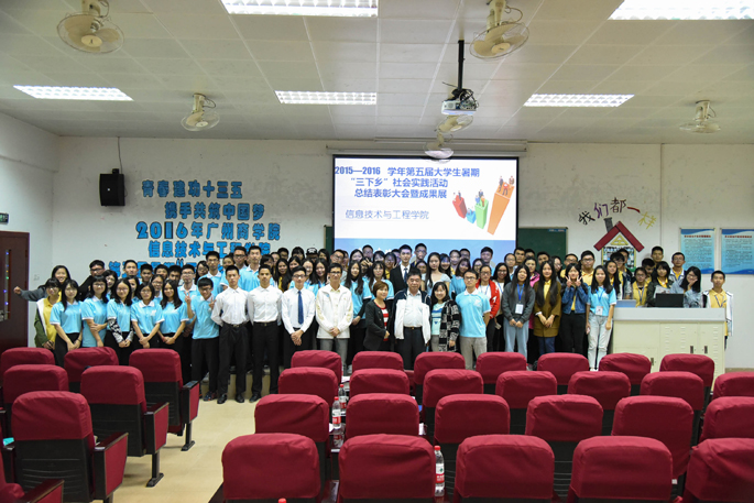 为了表彰“情筑桃源”三下乡服务队在2016年三下乡活动期间的优秀表现,进一步宣传和带动更多学生踊跃加入三下乡社会实践活动,广州商学院太阳成集团tyc33455团委于2016年11月9日晚上19点30分在康大第二报告举行主题为“青春建功十三五,携手共筑中国梦”的“三下乡”社会实践活动总结表彰大会暨成果展。参加本次三下乡表彰大会的有校团委副书记曾富强老师,信息学院院长姜灵敏、团委书记王轻纱老师、学生会指导老师王莉,“情筑桃源”三下乡服务队指导老师谭小龙,各学院学生干部代表,服务队全体队员以及信息学院16级同学。