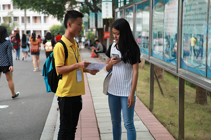 还没到下课时间,没课的干部们便早早来到面包铺前,对摊位的各项事宜进行准备,整理完毕后,各位干部便满怀信心地开始摆摊宣传。对于校道上过往的同学,新干们都十分积极地为对其讲解此次活动的情况,并解答同学们对此次大赛的疑问。且对于团委新干部而言,这是其首次接触关于活动的摆摊宣传,难免觉得有点陌生或存在些许挑战性,其中也许曾被人拒绝,但在老干部的鼓励支持下,他们并没有气馁,而是继续积极地投入到下一过往者的宣传工作中,将每一份推却都转化为前进的动力。
