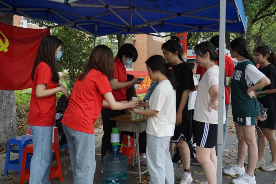 在体测进行时,值班的党员同志们热切地关心因长跑而体力不支的同学,在终点处时刻关注他们的身体状况,为体测的同学们准备好饮用水、葡萄糖等,并为同学们加油鼓劲、及时搀扶体测后头晕、心悸等同学前往医疗点进行治疗。在同学中播撒着温暖的种子,赢得了老师和同学们的一致夸赞,党员同志用实际行动展现了“奉献、友爱,互助,进步”的志愿服务精神。