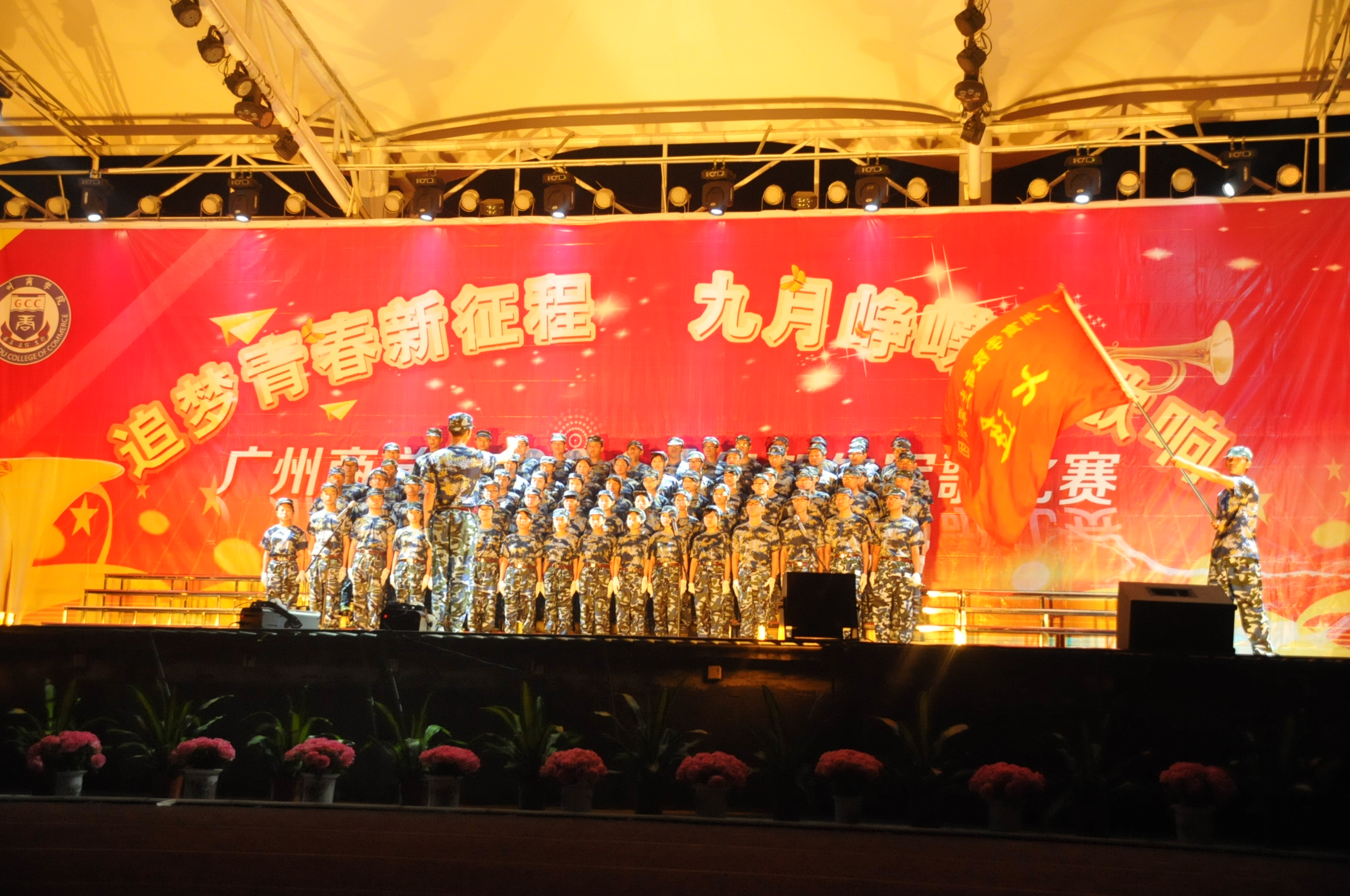 经过烈日的考验和艰苦的训练后,新生们终于迎来了在军训中最欢快的晚会——军歌晚会。这是一场极致精彩的表演,参与的所有成员都是由新生们组成,在火辣的开场舞和介绍后,军歌正式开始。