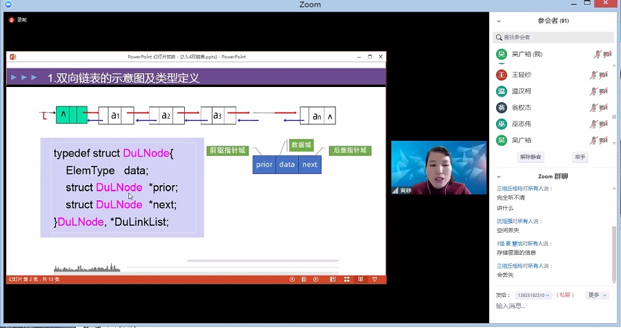黄静老师的“数据结构”课程于当天14:30在Zoom平台开课,主要内容是线性表-循环链表。黄静从平台预习学习开始,注重课程内容衔接,理论与实践内容的结合,灵活运用直播平台软件,PPT和开发环境IDE很好结合,演绎了循环链表插入和删除等重点内容,期间注重与学生的互动交流。肖品辉老师点评了作业的情况和上机的注意事项。