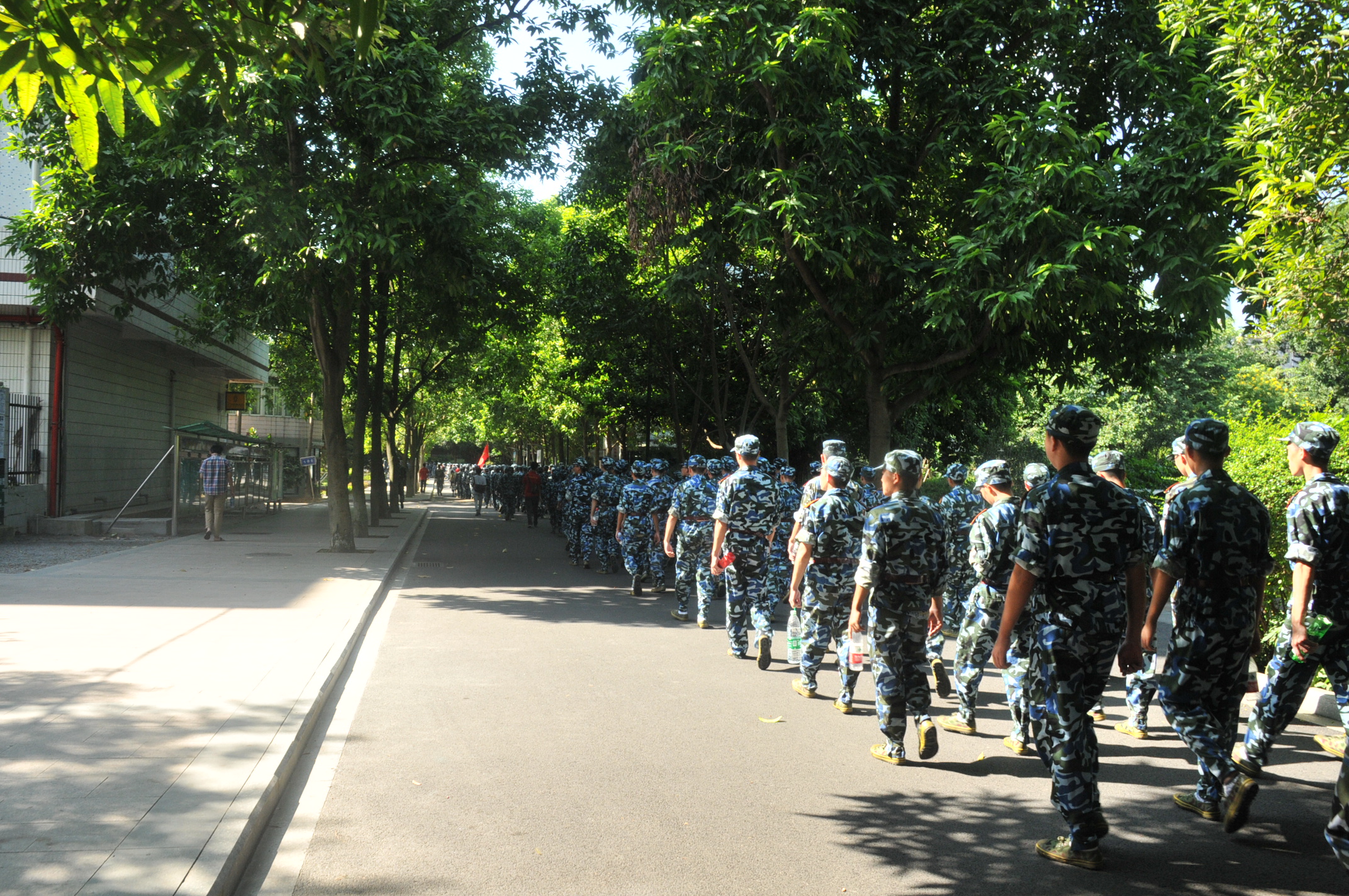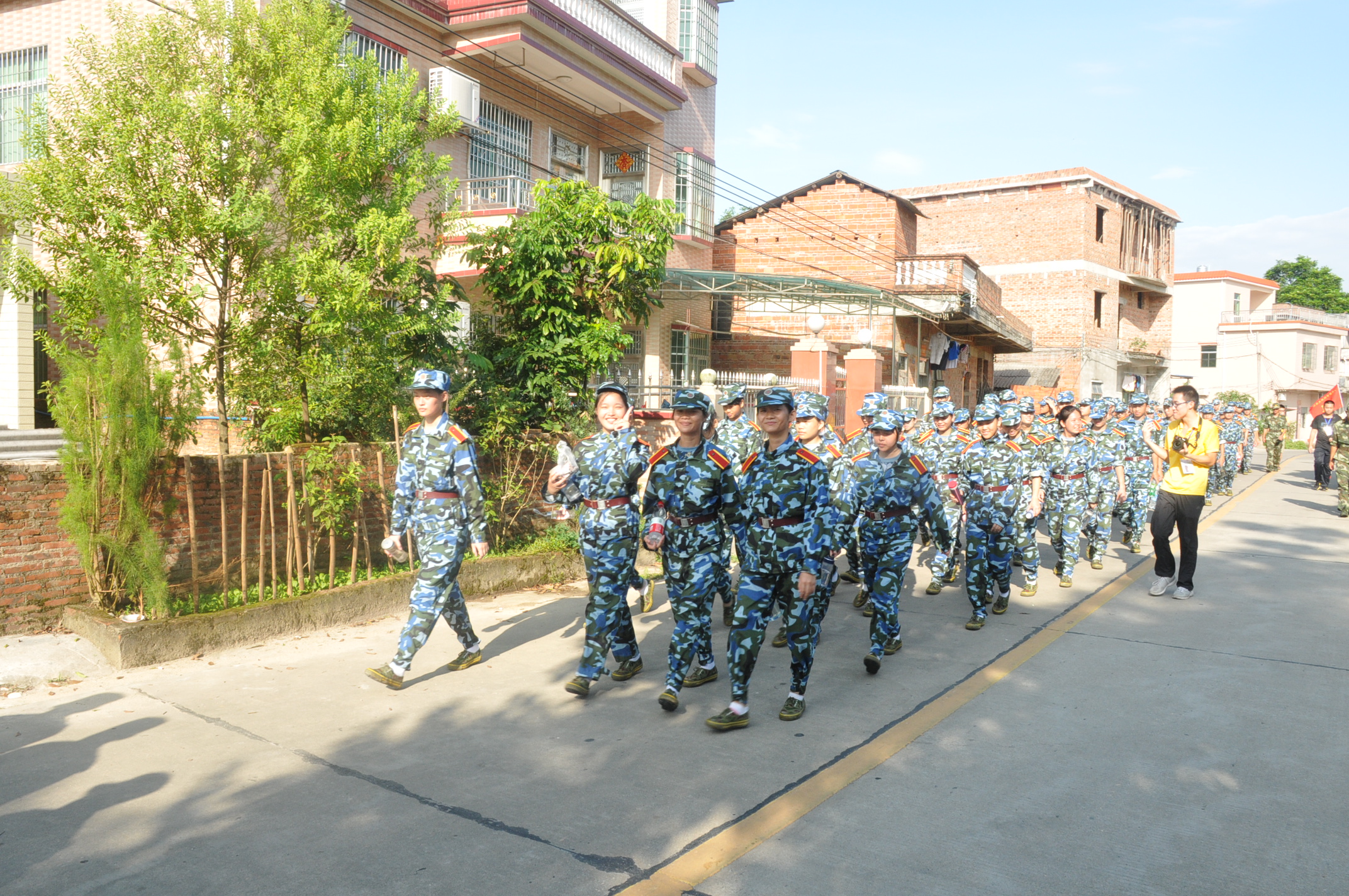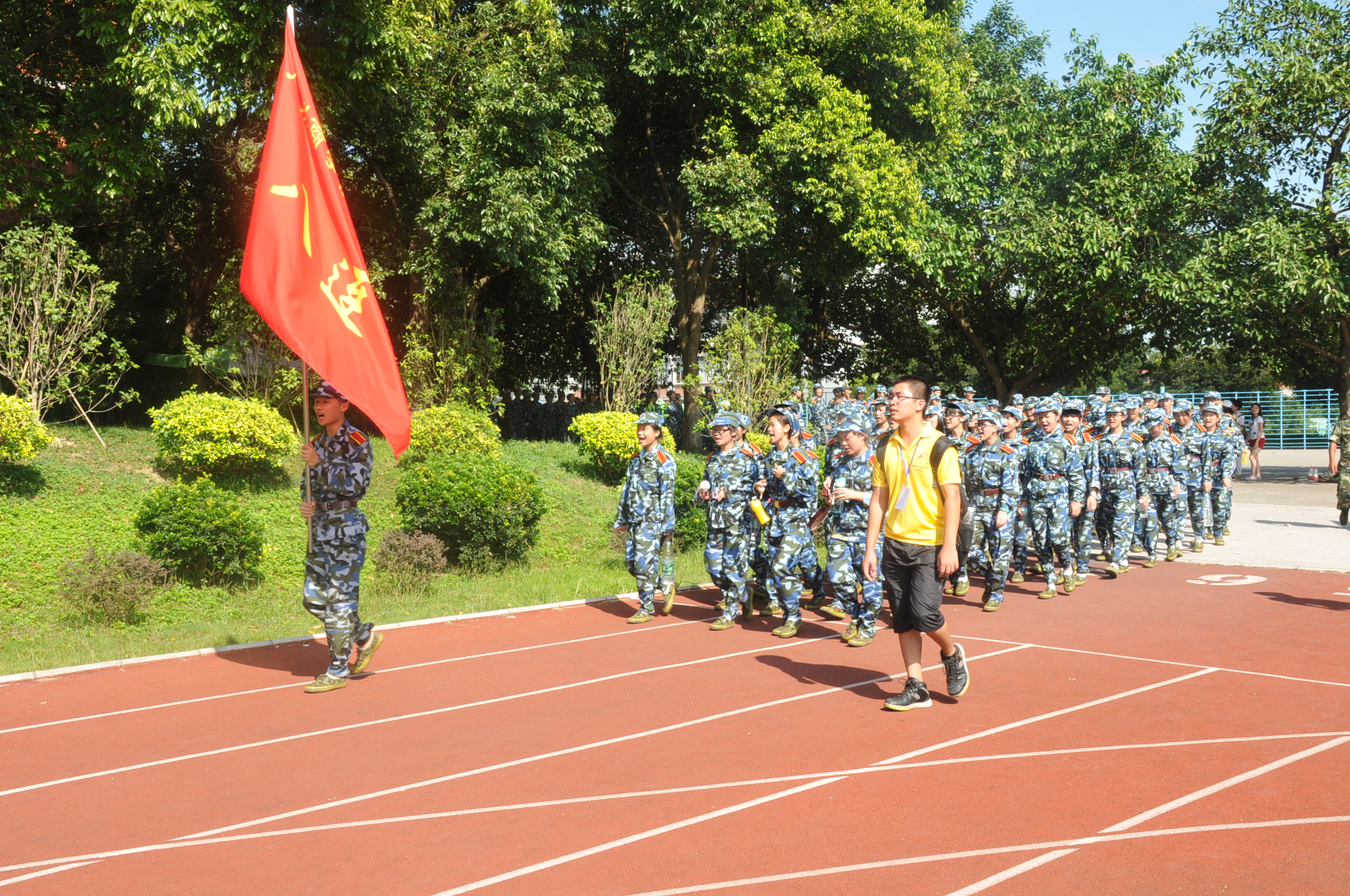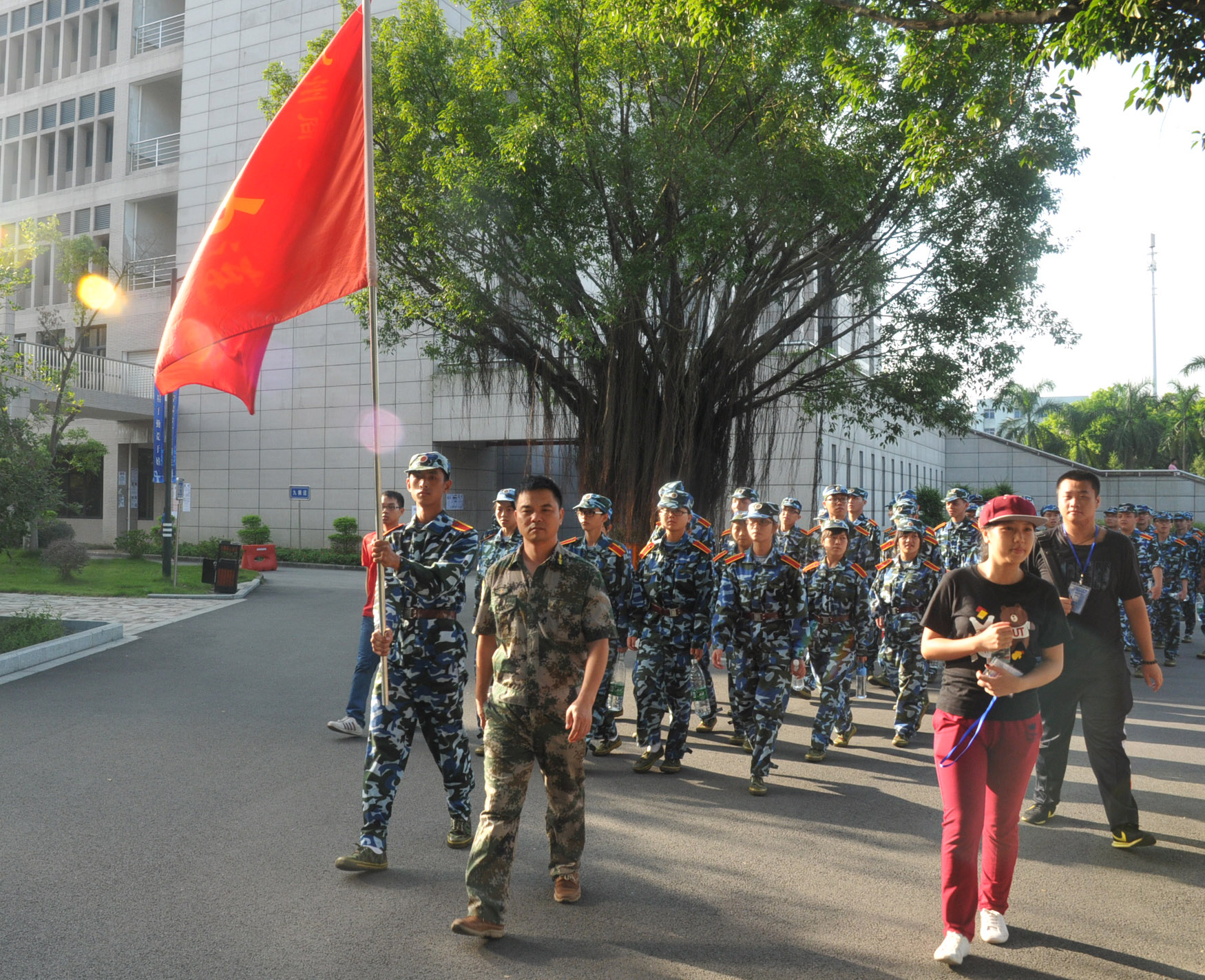 行进期间,新生们身穿迷彩,排列整齐,走过校道,穿过马路,队伍中不时传来响亮的口号声、嘹亮的军歌声,这成为沿途一道独特的风景线。他们克服了炎热天气带来的不利影响,始终保持着步调一致,朝气蓬勃,英姿勃发,充分地展现了我系学子良好的精神风貌。