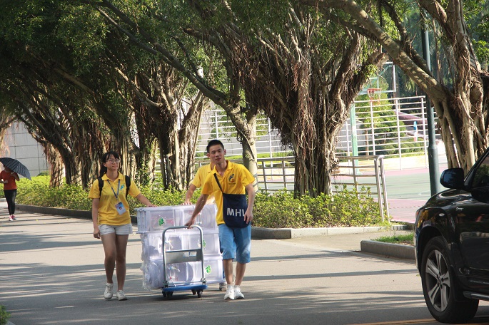 为保障军训的后勤服务,在新生军训前,团委、学生会干部们绸缪桑土,提前采购好常用药物,进行简单的药物使用练习。为方便让新生更好地训练,每天团学干部们早早将物资搬到训练场,物资不够用时及时做好补充。当有学生身体不适时,在大本营的干部们会主动协助学长照顾新生,为其扇风祛热、准备一杯葡萄糖水,给新生们送上学院的关怀与照顾。为给身体不适的新生提供休息场地,干部们搬运20顶帐篷,整齐摆放在训练场边;为给新生留下军训时候的美好回忆,团学干部们用相机捕捉他们训练的精彩。