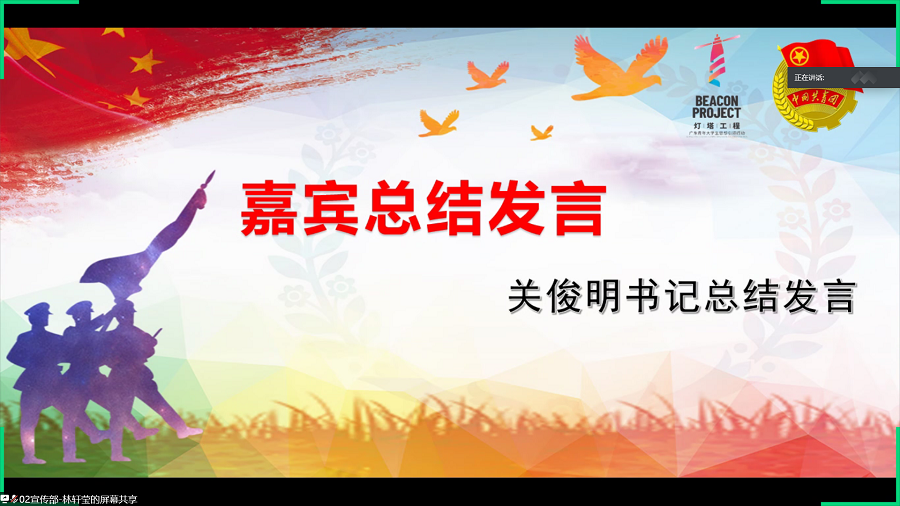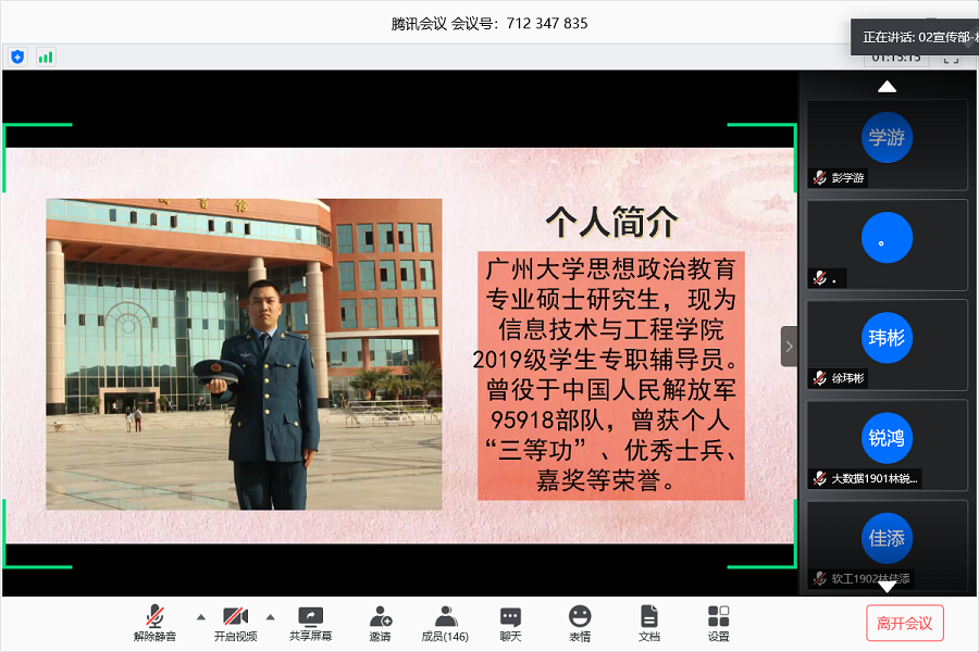 为了响应党和国家的号召,做好征兵的宣传工作,强化大学生服兵役的责任感和参军保卫祖国的意识,太阳成集团tyc33455团委于5月12日晚在腾讯会议线上举办以“青春正当年,共筑强军梦”为主题的参军线上交流会。出席本次活动的嘉宾有太阳成集团tyc33455党总支书记关俊明,团委书记兼17级辅导员郑开勋、团委副书记兼18级辅导员黄丹琪,19级辅导员郑子松, 19级助理辅导员何韶健、谢锐朗,广商学生国防教育协会会长宋万里。