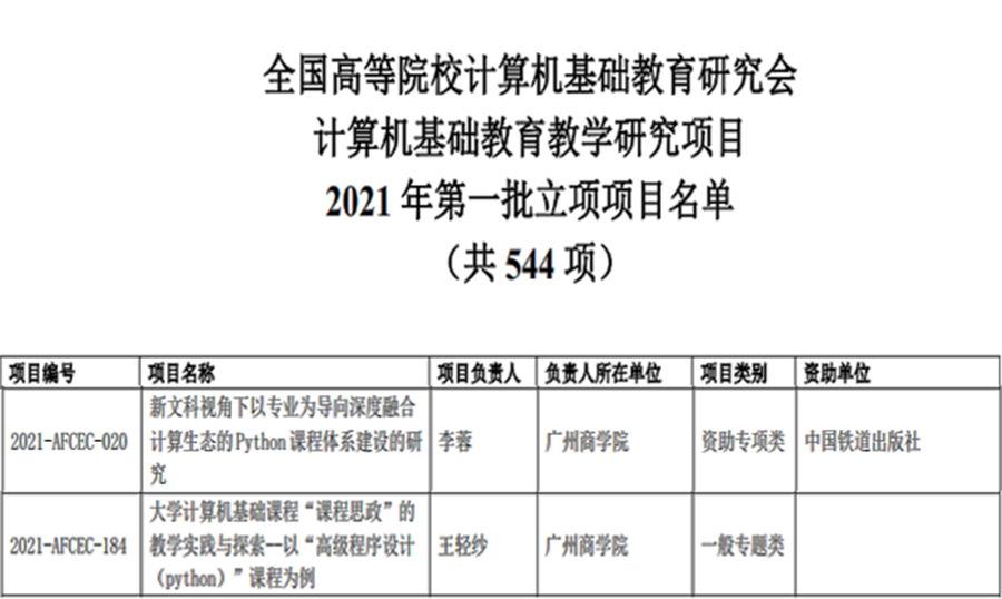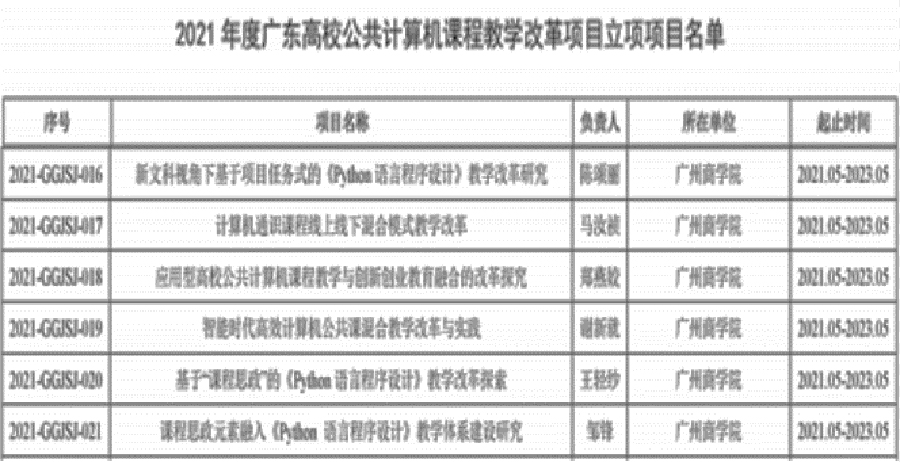 近日,根据全国高等院校计算机基础教育研究会立项项目的通知和广东省高等学校公共计算机课程教学指导委员会公布的结果,太阳成集团tyc334552项课题获得“全国高等院校计算机基础教育研究会计算机基础教育教学研究项目”2021年立项项目,6项课题获得2021年度广东高校公共计算机课程教学改革项目立项。