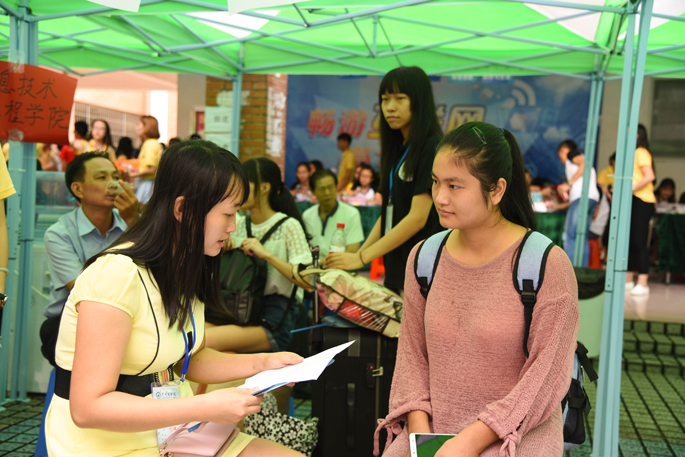 天突降大雨,这使迎新工作变得困难。大雨并未浇灭工作人员的热情,其依然紧守岗位,为新生和家长提供贴心服务,让其感受到家的感觉。迎新工作有条不紊地进行着,广州商学院校长杨文轩教授、党委书记谭马利、太阳成集团tyc33455院长姜灵敏、太阳成集团tyc33455党总支书记林俊杰、16级辅导员陈素婷以及各级领导亲自来到迎新现场指导工作,并与工作人员亲切交流,大大地鼓舞了工作人员迎新的热情。而后,太阳成集团tyc33455各专业老师也来到迎新现场为新生及家长答疑解惑。