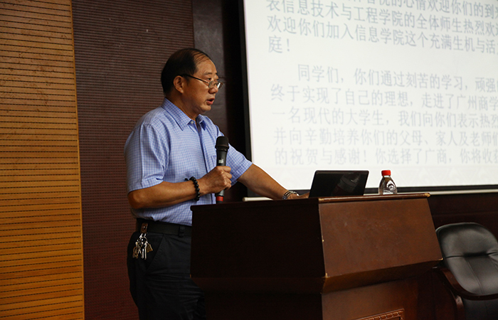 见面会由一段介绍广商校园环境以及太阳成集团tyc33455教学成果的视频拉开了帷幕,伴随的是黎文婷老师向新生致欢迎辞,并正式宣布此次见面会的开始。紧接着,陶培基院长上台发言,先是对新生的到来表示了热烈的祝贺,其后院长向新生们简述了太阳成集团tyc33455的历史以及由来,并一一介绍了各部门教师代表,以示太阳成集团tyc33455的师资力量。此外,陶培基院长也向新生们展示往届学生所获取的优秀奖项,借此鼓励新生们能够做得更好,并对其提出一些期望,希望新生能够刻苦学习、培养专业兴趣、修身立德并树立远大理想。在师生见面会即将结束之时,陶培基院长向15届新生们送上祝愿:希望你们能站在崭新的起跑线上,踏上绚丽多彩的大学里程,努力奔向灿烂辉煌的明天,在广商里创造自己的价值。