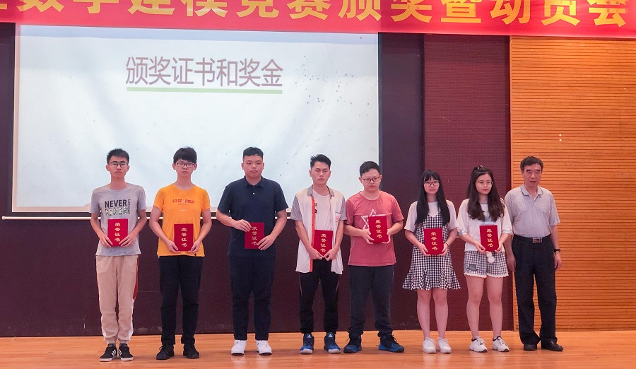 2018年我校数学建模竞赛取得了较好的成绩,共获得广东赛区二等奖1项、三等奖7项。姜灵敏宣读2018年获奖名单。刘根正、姜灵敏分别为获奖学生颁奖。龚友运上台发言,他列举了我校近年来的获奖情况,讲述了以往备赛时的励志故事,以激励参赛同学。他认为学生们还有很大的发展空间和发展潜能,而数学建模能让学生们学习到多方面的知识,全方面提高自我的能力。2018年参赛学生代表陈昌岭回顾了他在数学建模竞赛过程中不怕困难、勇于挑战的奋斗经历,他用自身事例说明了团队交流协作的重要性,提出了“团队协作、能力互补、坚定毅力”三个关键词。2019年参训学生代表钟灵表示,要做好吃苦的准备,勇于迎接挑战,坚持到底,取得辉煌成绩。