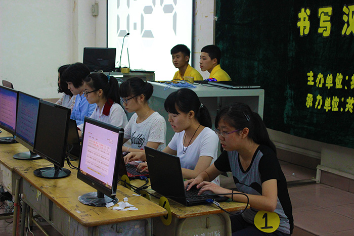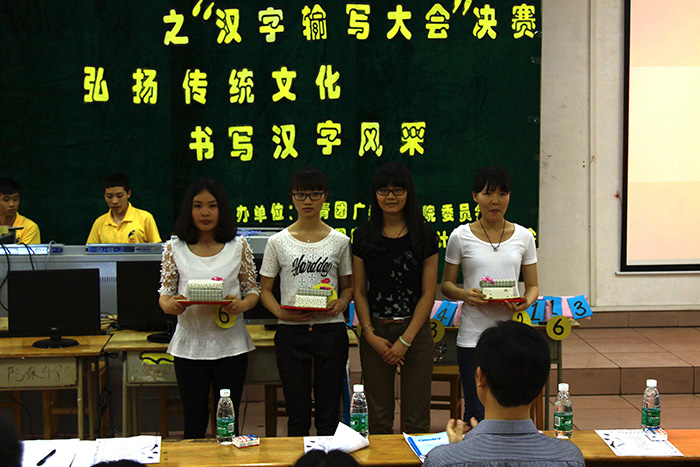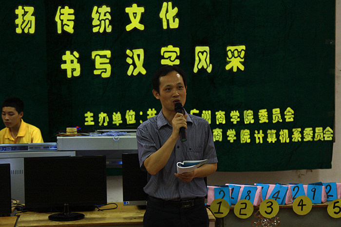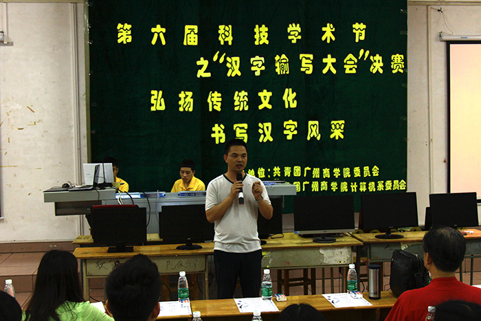 为增强广商学子的汉字学习兴趣,提高其汉字书写能力,使其更好地传承“汉字”这一民族文化瑰宝,计算机系团委于4月19日晚上19:30在课室a109举行主题为“弘扬传统文化,书写汉字风采”的第六届科技学术节之“汉字输写大会”决赛。莅临本次大会的嘉宾有思想政治理论课教学部主任郑维铭老师和副主任王相东老师、计算机系党总支钟远辉书记、计算机系14级辅导员毛西月老师以及各兄弟系代表。