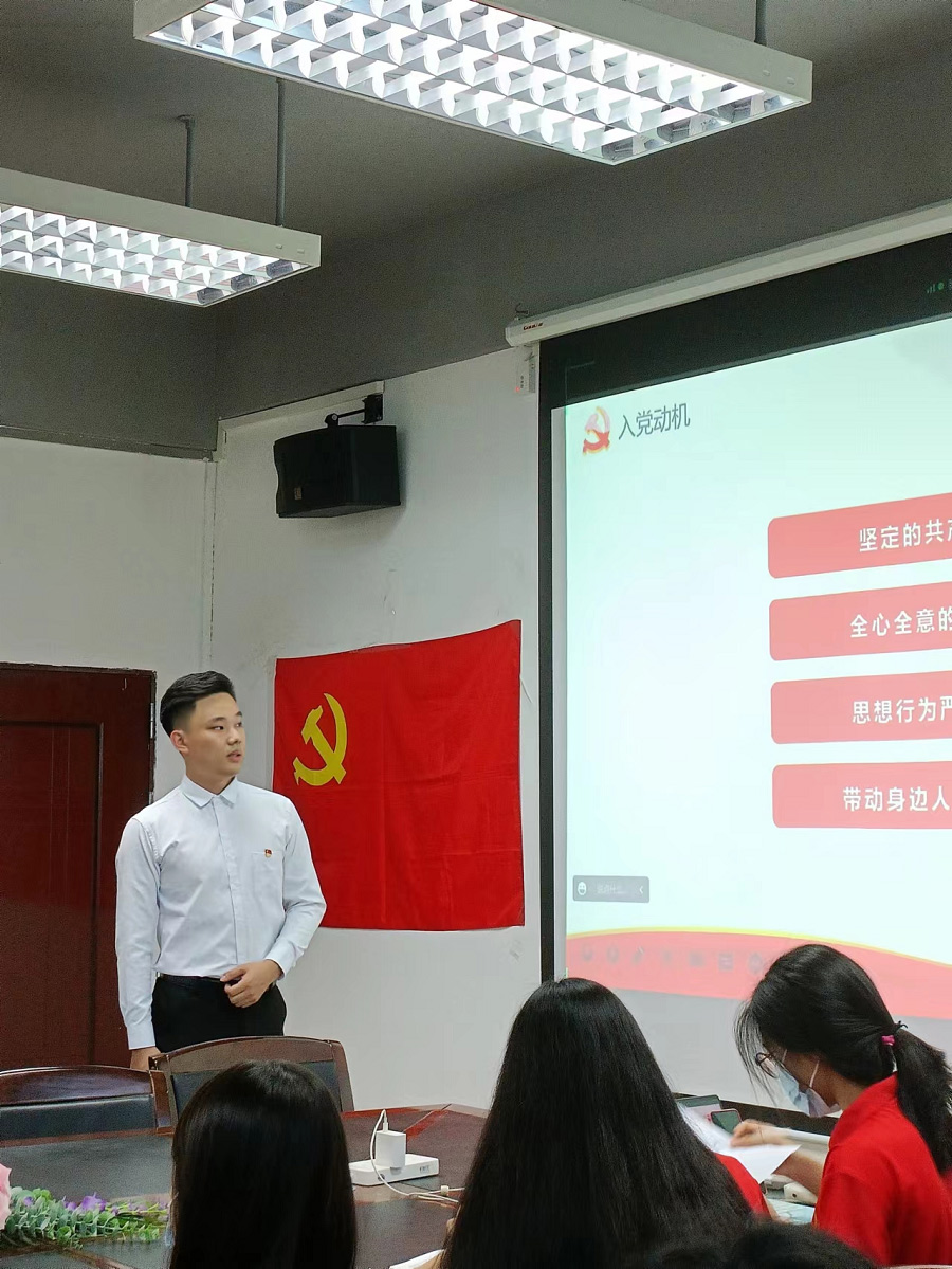 第二项议程由潘高峰、陈佳豪2位同志依次从思想、学习、工作、生活等方面向党组织汇报一年来自己的情况和存在的不足之处,表明了下一阶段改进的方向和决心,提出转为正式党员的申请。