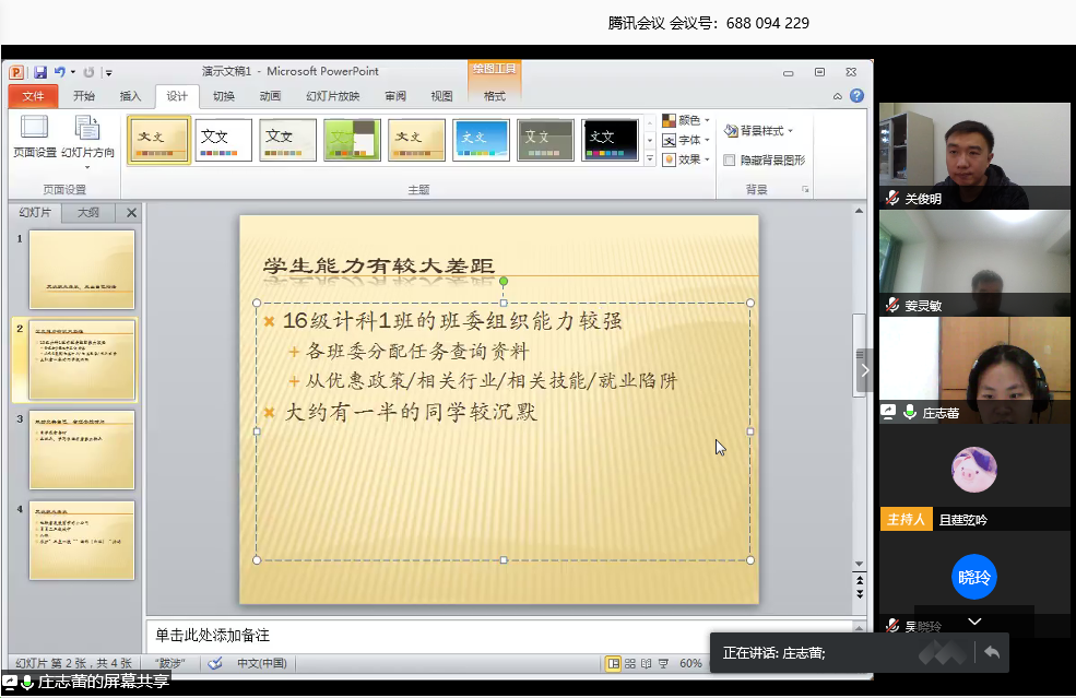 首先,由2016级辅导员陈素婷从考研、考公、就业创业等几方面分析了2020届毕业生就业摸底整体情况以及正在进行的就业指导工作;党总支书记关俊明分析了当前就业形势,回顾学院历年就业情况,并就2020届就业工作因新冠肺炎疫情影响、国内外经济下行压力及初次就业率统计时间提前等新变化,从毕业生当前所存在慢就业、就业目标不明确、就业资源不足等问题提出解决思路,他强调要重点关注就业困难、心理问题学生的就业帮扶工作。李蓉老师就面对当今就业形势如何进行职业生涯设计分享了参与软工1601班班会深入学生就业指导的宝贵经验,庄志蕾老师围绕 “更改就业角度,走出自己的路”主题分享,从计科1601班学生能力差距较大提出选择有发展前景的小公司、参军入伍等就业工作指导;会后各班主任在群上围绕毕业生学生现阶段就业现状以及学生就业指导的方向进行了研讨。