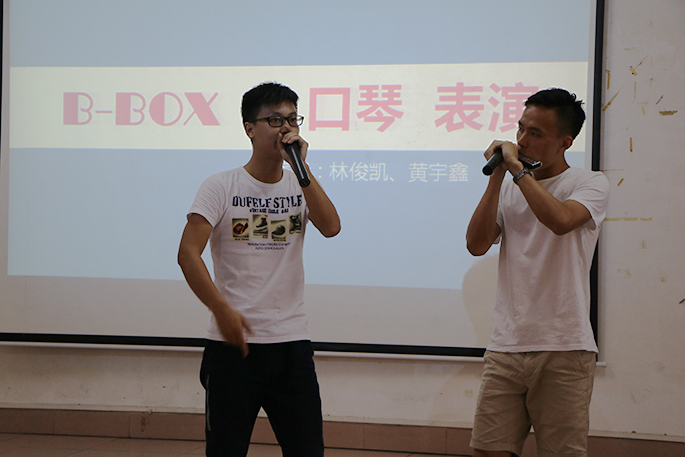 愚昧盲目的生活是无感,没有目标的人生是空洞的,令人印象深刻的致辞仍回荡脑海,回味中便传来动感十足和旋律轻快的节奏,这是由14级应电班的黄宇鑫和14级网工一班的林俊凯所带来的B-box和口风琴合奏,调动了全场的气氛,使得在场学生也跟着律动。