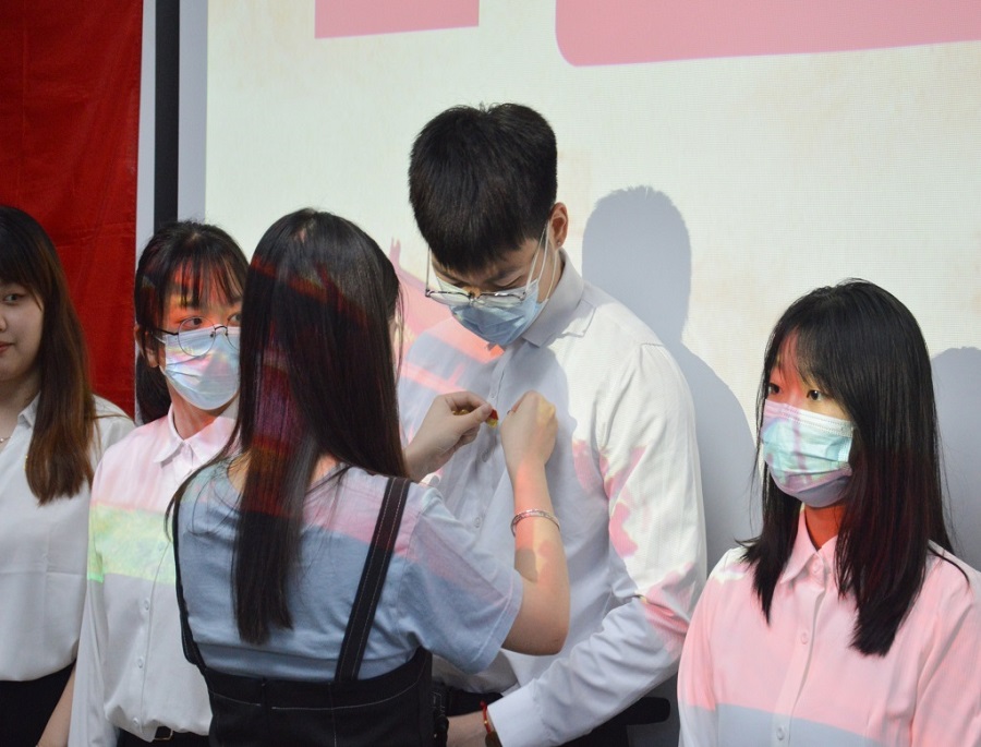随后党支部学生副书记吴雁敏同志宣布支委会对温玉柱等8名重点发展对象的审查结果全体通过。在与会党员对重点发展对象是否符合预备党员接收条件发表意见后,由党支部宣传委员林奕锐同志宣读支部大会决议:同意温玉柱等8名重点发展对象接收为中共预备党员。接着在党支部组织委员林钦龙同志的带领下,全体党员在党旗下庄重宣誓。随后由党支部书记饶宏玉同志在党旗下为温玉柱等八名预备党员佩戴党员徽章。