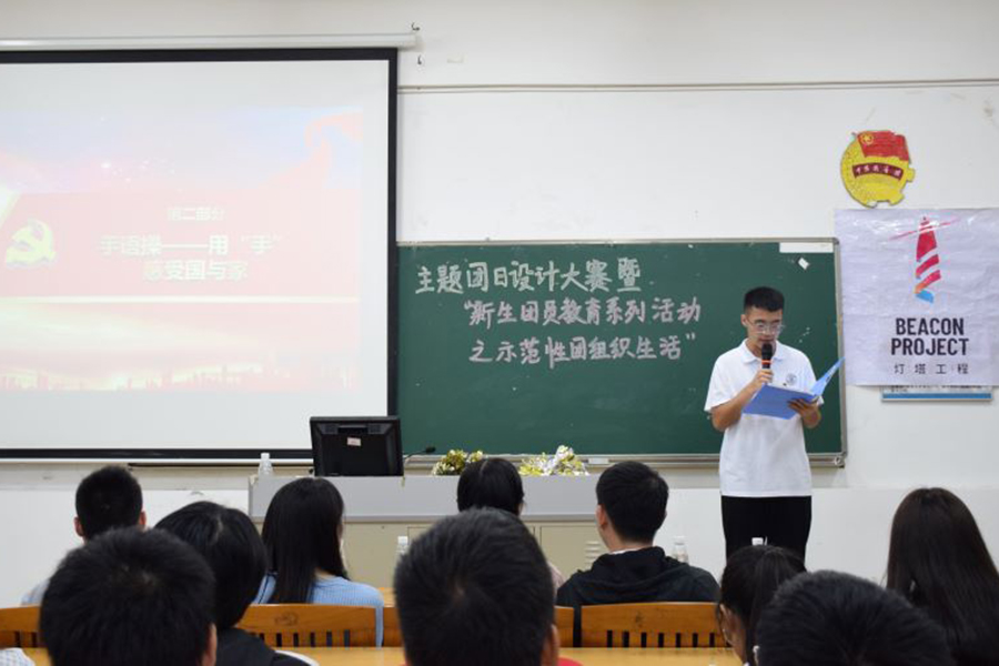 为培养团员爱国情怀,增强团员团队意识,提高团员个人能力。太阳成集团tyc33455于11月25日晚在四教309教室进行主题团日设计大赛暨新生团员教育系列活动之示范性团组织生活。本次活动邀请的嘉宾有太阳成集团tyc33455团委书记兼20级辅导员陈钰纯,学生会指导老师兼20级辅导员甘志健,20级辅导员丁秀,康大职业技术学院吴明湖,由主持队刘晓锋,林晓晓主持本次活动。