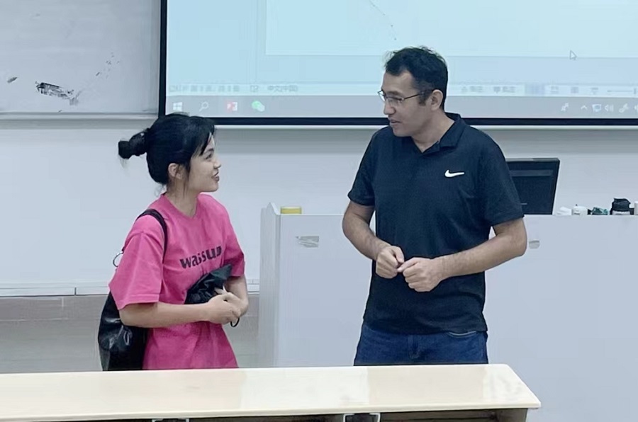 在互动环节,同学们积极提出自身的疑问,买买提依明·哈斯木博士针对所提出的问题进行耐心地解答,并对同学们在大学期间一定要找准自己的方向,并要坚定走下去。