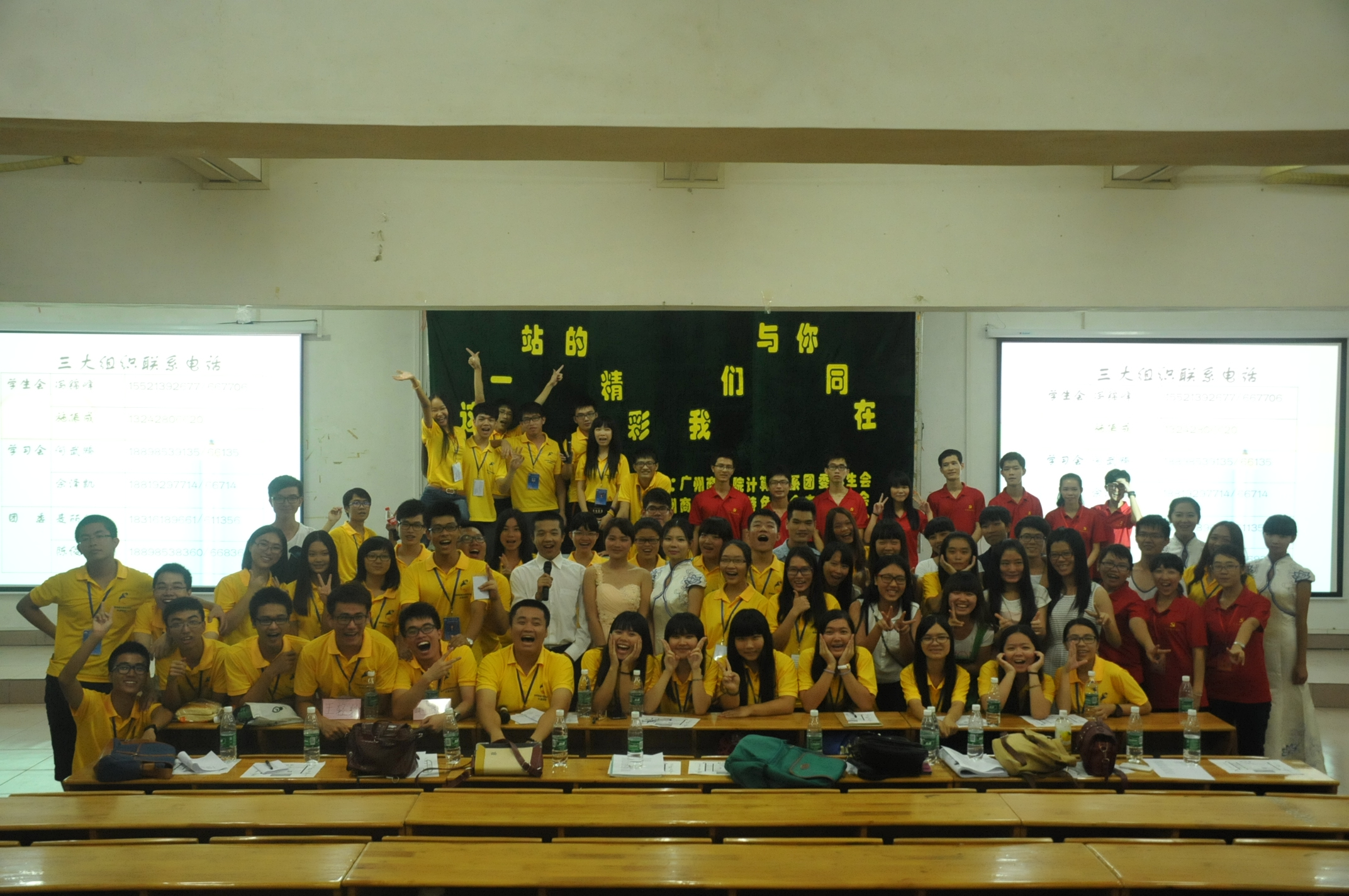 大会伊始,14级辅导员毛西月老师进行了发言,感谢了三大组织在军训和迎新工作中对新生的帮助。随后,大会正式开始,三大组织通过设立学生会号、学习会号、团委号三辆火车作为介绍的序幕。首先,学生会通过一段热舞带动起全场的气氛,掌声、欢呼声回荡在教室当中。紧接着在屏幕中播放出一张又一张照片,让新生们更好地了解到学生会的每一个部门和职能。视频过后,学习会身着标志性的红衣华丽登场,唱着经典歌曲《光辉岁月》。这当中也不乏有观众随着音乐放声高唱,让大会的气氛再一次进入高潮。最后出场的是计算机系团委,随着一段视频过后,小黄人陆陆续续登上舞台,为在座的观众献唱一首《仰望星空》。表达梦想并不遥远,只需要踮起脚尖便触手可及。在三大组织表演完节目后,来到了学弟、学妹最期待的环节,师兄、师姐大解惑。提问开始后,现场的师弟、师妹们是争先抢后的举手提问。场上的师兄、师姐也一一回答出他们的问题,帮助他们更好地了解三大组织与快速融入大学生活。最后,大会在三大组织和学长们共同演唱的《怒放的生命》中落下帷幕,虽然在视频播放当中有一些小意外发生,但是大会并没有因此而逊色,反而让新生们更加记住了我们!
