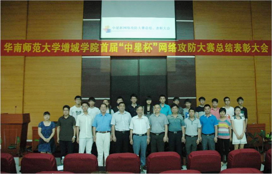 张忠福代表学院宣读了首届“中星杯”网络攻防大赛的获奖表彰决定。在本次比赛中,共有183名学生参加,共分成66组,最终有12组学生36人获奖,到场的领导嘉宾为获奖学生颁奖。