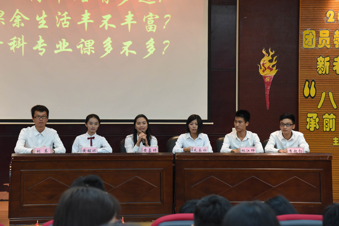 活动开始,同学们共同观看了关于中国红军长征胜利80周年的视频——《风雨80》,一段无法被时间遗忘的历史就呈现在同学们的面前,红军长征精神深深地感染着同学们。随后,进入优秀学生代表发言环节,黄铭琪同学和刘东同学围绕大学四年时间规划和学科竞赛的相关问题,和同学们分享了个人的心得体会和学习方法;毛乐欣同学和黄嘉琦同学分享其个人对大学生活的感受,包括学生干部注意事项和全面发展相关问题;李起勃同学和林江绅同学向新生介绍其所代表的团支部取得的优秀成绩,并向新生就如何构建如何优秀团支部提出了部分建议。之后开展了别具生面的新老生问答环节,新生们纷纷提出心中的疑惑,如怎样兼顾学习和组织工作等问题,师兄师姐们则耐心地为其一一解答。在此期间大屏幕播放的视频《青春回忆录》勾起了新生们入学报到时和军训期间的美好回忆。