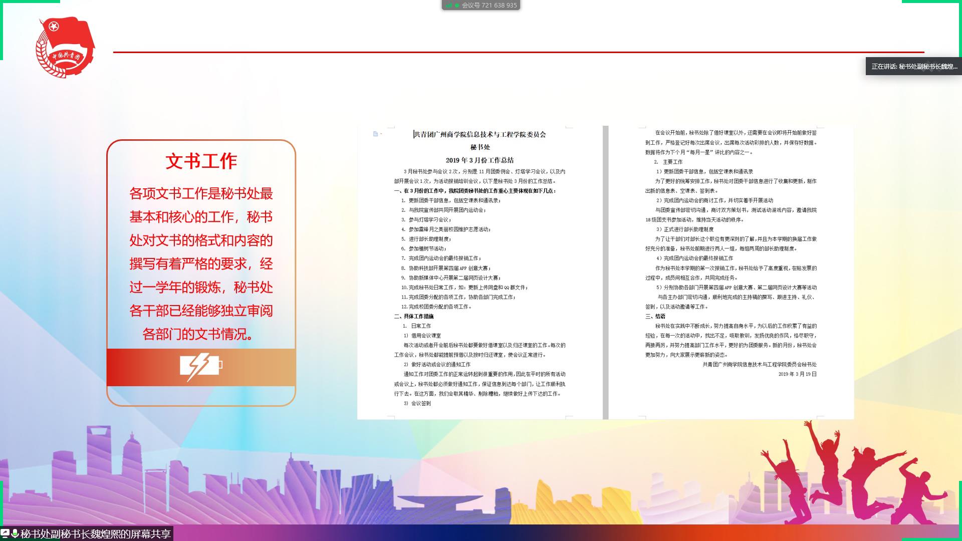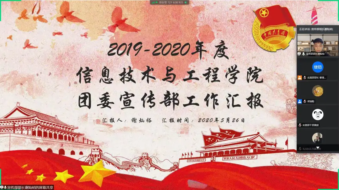 为了加强团委中部门与部门之间的交流,为了提升我院学生综合素质和技能。太阳成集团tyc33455于5月26日晚在腾讯会议线上举行了团委优秀部门评优会议。出席本次活动的嘉宾有团委书记兼17级辅导员郑开勋、团委副书记兼18级辅导员黄丹琪。