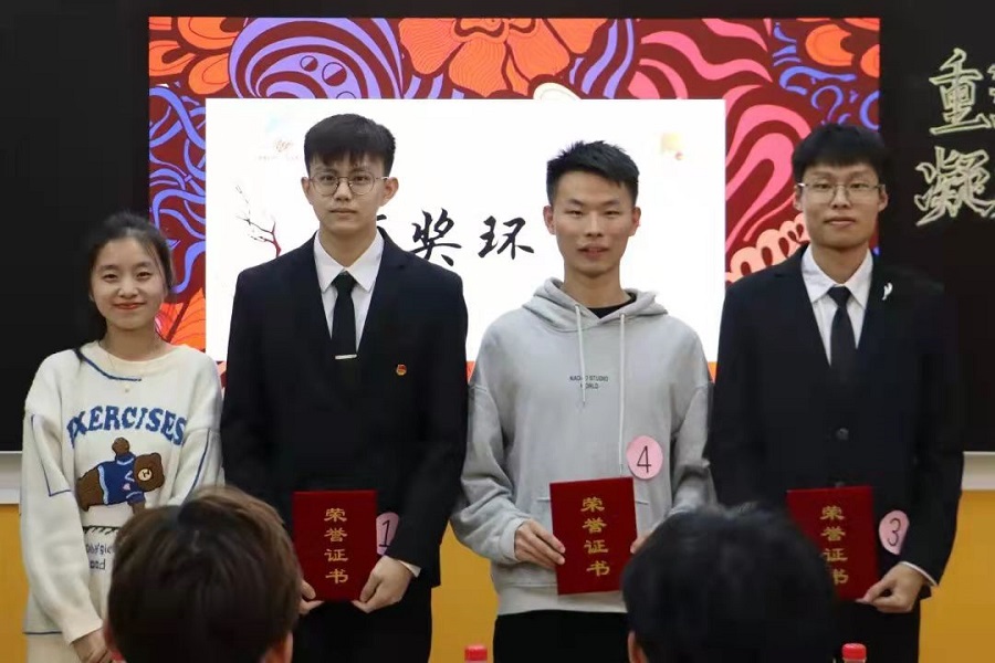 主持人宣布完比赛环节及评分规则后,比赛正式开始。首先进行的是诵读环节,五位选手按出场顺序抽取稿件,并依次上台进行自我介绍,他们用自己独特的风格,从不同的方式、角度,表达对中国共产党的敬仰之情。紧接着,进入第二环节,选手随机抽取有关党史内容的卡片,并对其给定的内容进行演讲,他们用自己满腔的热情、将理想付诸言语,他们的声音,时而低沉,时而高亢,眼神坚定,让同学们沉浸在浓厚的党史氛围中。本次比赛的最后环节,组队诵读,选手们配合默契,以真挚的情感,洪亮的声音,慷慨激昂的情调,将比赛推向高潮。最后,评委们选择出最终获奖选手。他们分别是:冠军——3号选手朱伟茏,亚军——1号选手邓广源,季军——1号选手赖世鹏。