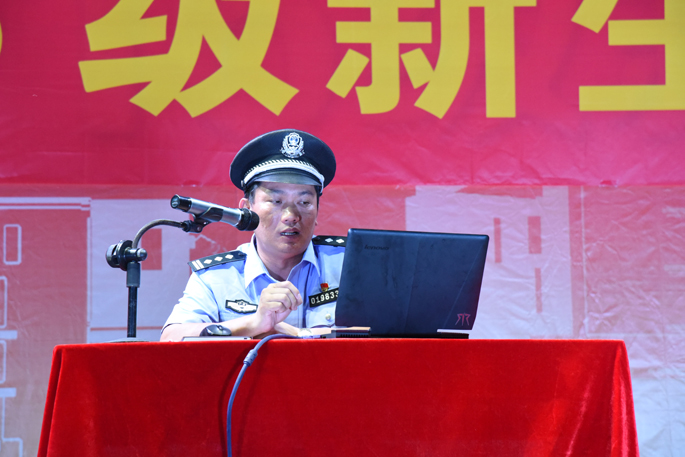 副所长首先列出各类犯罪案件的比例数据,以此来告知新生要注意提高防范意识,其举出具体校园犯罪案件,让新生们意识到校园犯罪案件就在身边,警惕意识不可缺。其中在校园内发生的案件最多的是盗窃案件和诈骗案件,盗窃案件发生的原因往往是学生不注意保管自身财物,从而让盗窃者有机可乘。诈骗案件的发生也大都是受骗者警惕性不足,轻信陌生人的电话、短信。副所长还提出除了要注意校内安全之外,也要注意校外安全,不要带校外人员进入校园内。