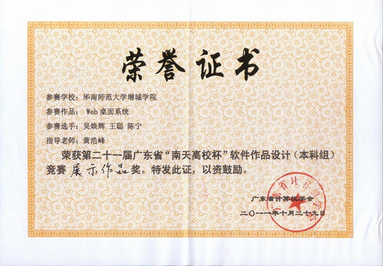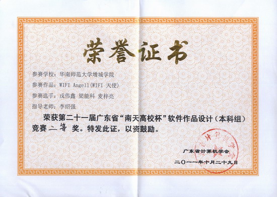 据悉,参加本届软件设计竞赛初赛的共有16所高校,在包括华南理工大学、华南师范大学、暨南大学在内的各大高校参赛的38件软件作品中,经专家组严格评审,有20件作品进入决赛。其中,计算机系李绍强老师指导09级计算机科学与技术(软件工程)专业学生戎伟鑫、梁能科和麦梓亮共同创作的“WIFI Angell(WIFI 天使)”获得二等奖,吴明珠老师指导08级计算机科学与技术(软件工程)专业学生李斌创作的“图像处理写作软件”以及黄浩锋老师指导吴焕辉、王聪、陈宁共同创作的“Web桌面系统”获得了展示作品奖。