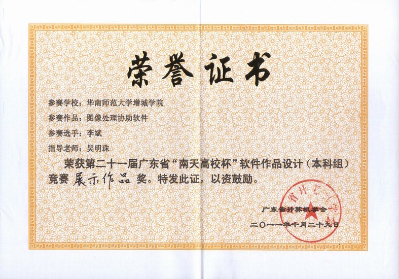 10月29日,由广东省计算机学会主办的第二十一届广东省“南天高校杯”软件作品设计竞赛(本科组)总决赛在广东工业大学(大学城校区)举行。计算机系副主任吴广裕带队参赛,经过一天激烈的竞赛,计算机系三个参赛队都获得了奖项。这是继第十五届广东省“高校杯”软件设计大赛以来,计算机系学生连续七届在该项软件大赛中获得奖项。