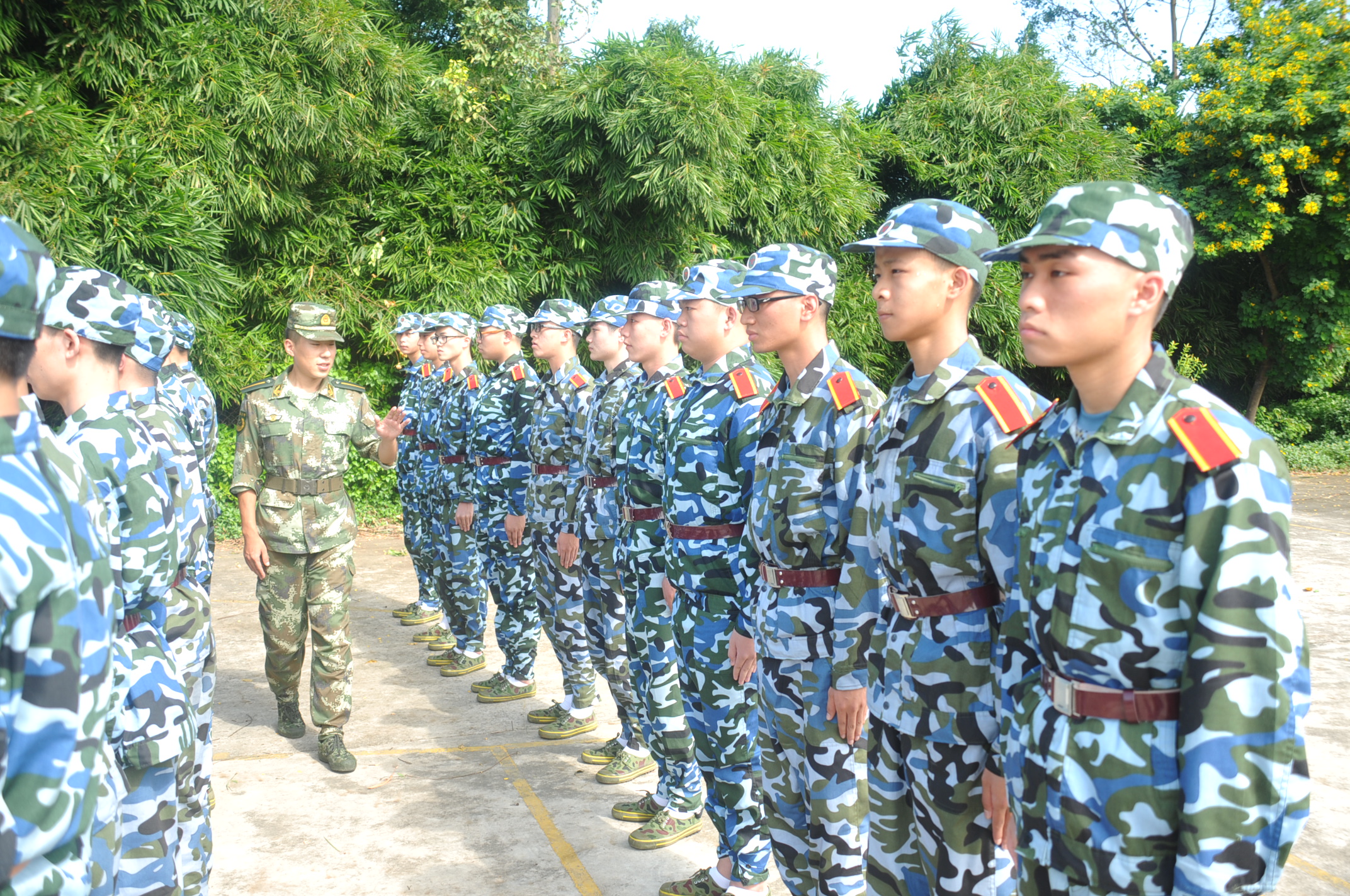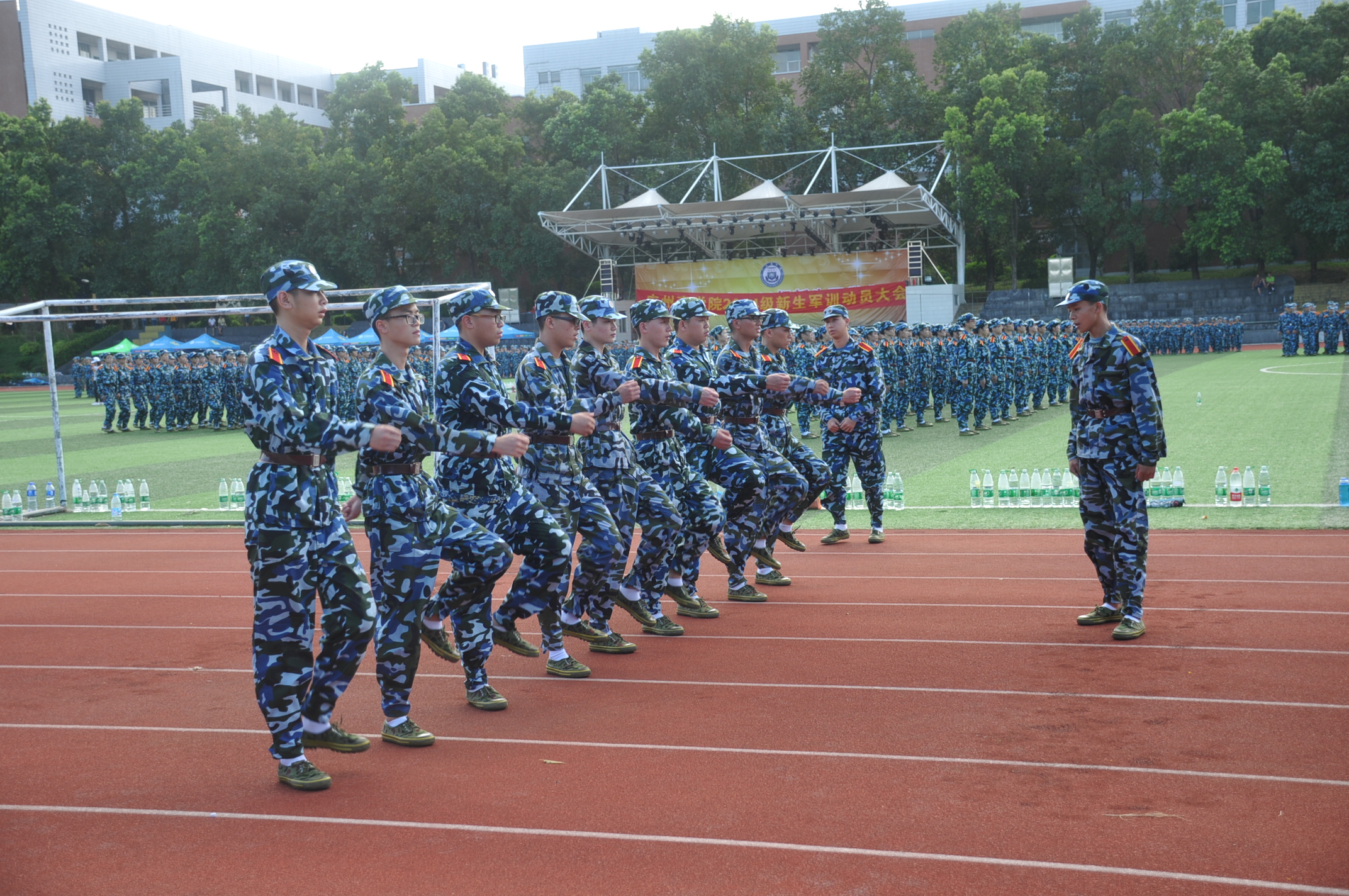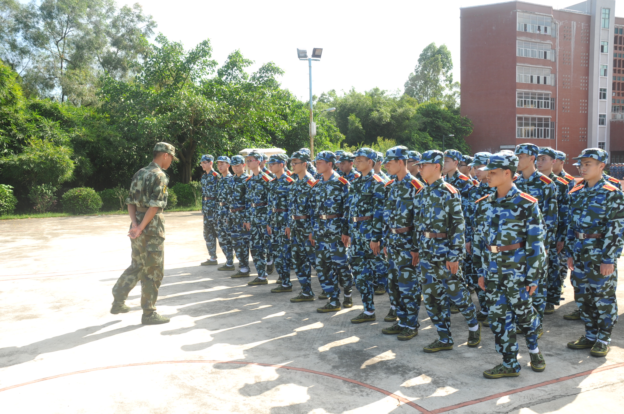 金秋九月,碧空如洗,在这秋高气爽、艳阳高照的晴天里,新生们开始了他们第二天的军训生活,望着那一排排的岸然挺立的背影,可以感受到大学生们的活力与激情;望着那一件件被汗水湿透的外衣,可以感受到教官们那令人尊敬、不怕苦、不怕累的军人气魄。即使是烈日当空,新生们在教官的指导下,练习踏步走,敬礼,军姿等。在休息时,唱响了洪亮的军歌响彻在校园的每一个角落。
