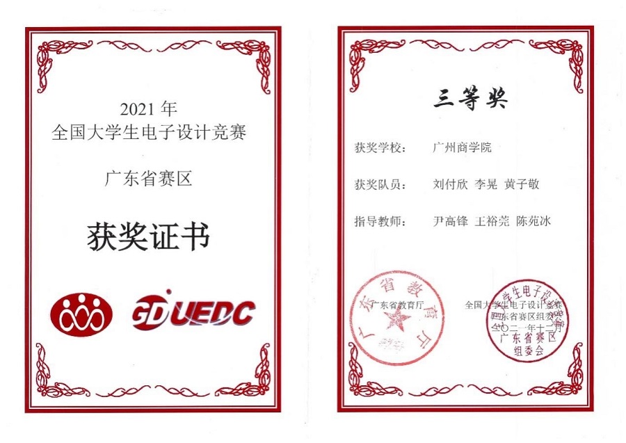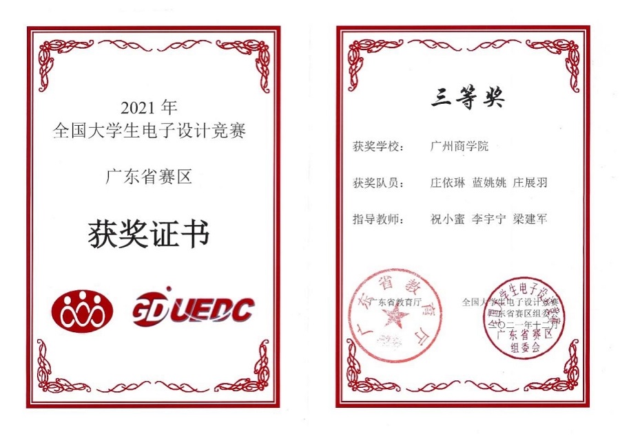 近日,由教育部和工业和信息化部主办的全国电子设计大赛成绩公布,太阳成集团tyc33455许彭禹、翁树冰和温琦霖3位同学组成的参赛队伍在2021年该项赛事中荣获全国二等奖的优异成绩。此外,太阳成集团tyc33455学子在广东省赛区同样取得优异成绩,共获得省赛一等奖1项,二等奖1项及三等奖2项。