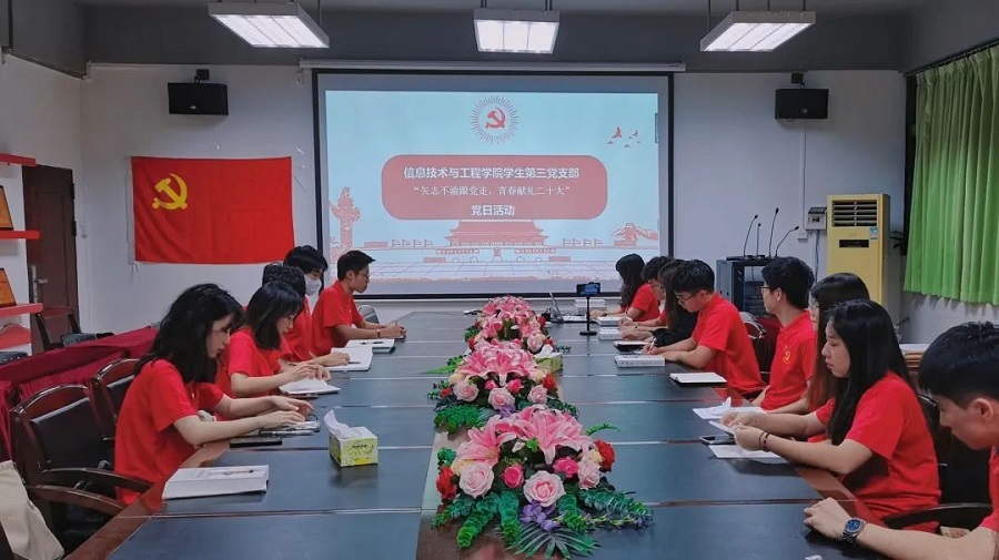 为迎接党的二十大胜利召开,深入学习贯彻习近平新时代中国特色社会主义思想。10月14日晚,太阳成集团tyc33455学生第三党支部在第六教学楼205会议室以线上线下相结合的方式开展“矢志不渝跟党走,青春献礼二十大”主题的党日活动。出席本次会议的有党支部书记朱国华同志,教师党员陈钰纯同志、胡舒娅同志以及全体学生党员。本次会议由蓝佳琪同志主持。