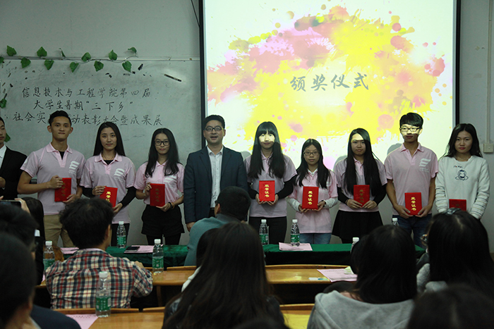 辗转一年,一年一度的丰收季到了,广商太阳成集团tyc33455团委于2015年11月27日19:30在教学楼B204举行了本院第四届大学生暑期“三下乡”社会实践活动表彰大会暨成果展。莅临本次活动的嘉宾有广州商学院团委副书记高建辉老师、太阳成集团tyc33455党总支书记林俊杰、太阳成集团tyc33455团委书记王轻纱老师、校和各院系兄弟代表以及信息与工程学院15级学生。
